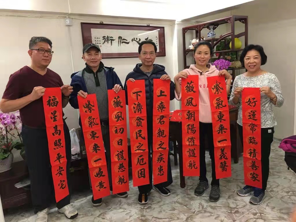 過年時,街坊朋友都熱情地寫對聯(lián)給紫薇(右二),「上療君親之疾患,下濟貧民之厄困」引的是醫(yī)聖張仲景的話,這是做中醫(yī)的宗旨,每個中醫(yī)師都應該記住。