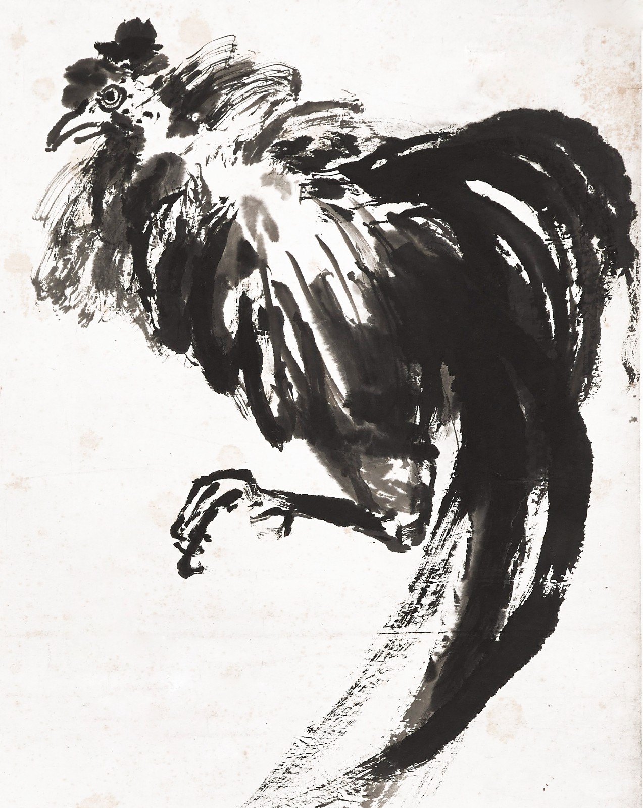 劉海粟描繪的鬥雞場景簡括生動,墨筆揮毫,取鬥雞之勢:一隻雄雞俯首低伏,腳掌抓地蓄勢待發(fā);另一隻雄雞騰空而起,羽翼抖擻,動態(tài)十足,腳掌前伸作出進(jìn)攻的姿態(tài),一場激烈的戰(zhàn)鬥即將開啟。作者自敘此畫為「信筆速寫不復(fù)有相可得,寧計(jì)其工拙耶?!惯@幅畫將「速度」與「動態(tài)」表現(xiàn)得十分精妙,雄雞看似形散,卻將專注的神態(tài)和富有個性的動作生動地勾畫出來,羽翼隨著動作高高甩起,隨筆勢旋轉(zhuǎn)揮灑,強(qiáng)調(diào)動勢,使靜態(tài)畫面充滿張力,鬥雞的強(qiáng)勢氣魄躍然紙上。