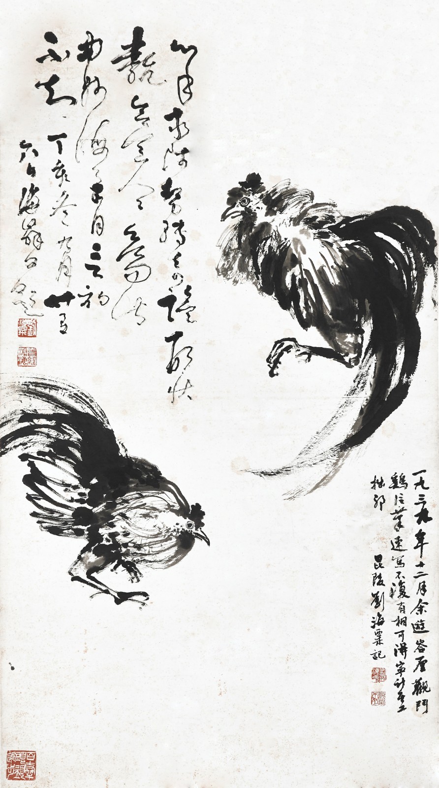 劉海粟作品《鬥雞圖》,1939年作,水墨紙本,122×67.5cm。