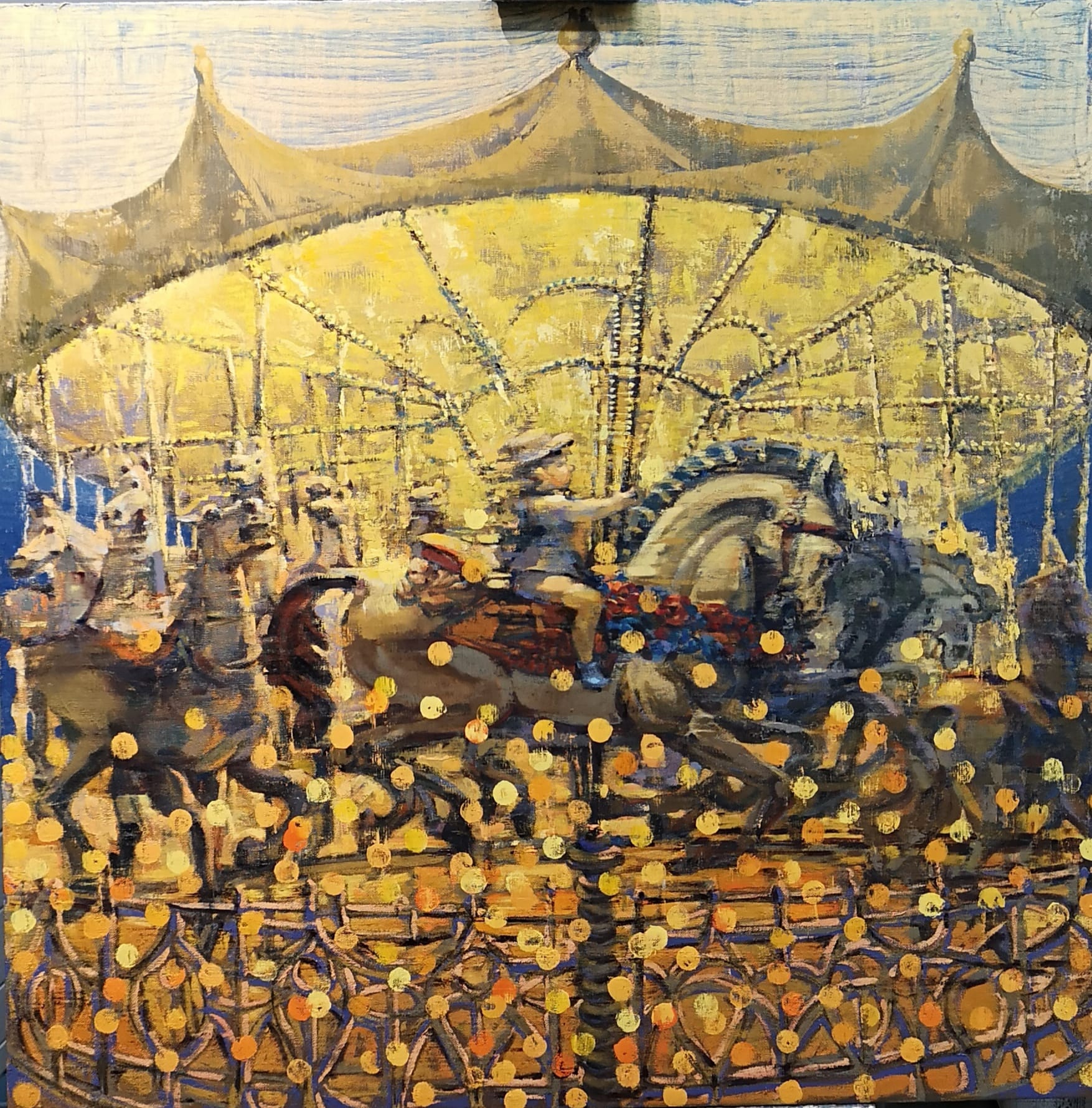 廖氏姐妹一家可謂家學(xué)淵源,藝術(shù)氣氛濃厚,廖爸爸是中國建築科學(xué)研究院工程師兼電影工作者,廖媽媽畢業(yè)於北京電影學(xué)院攝影系,廖井梅接受過正統(tǒng)藝術(shù)訓(xùn)練,技法純熟,對顏色尤其應(yīng)用自如,畫作線條流麗明快,盡顯自信而不自滿。而且擅於繪畫油畫及版畫,將具象及寫實的技巧融合抽象的視覺空間,呈現(xiàn)一種在現(xiàn)實與虛幻之間交接的獨特畫風(fēng),這次的新作她運用濃烈、對比的色彩,記錄無憂無慮的兒時光景,如展品《幸福時光》畫面中的深淺黃色點點,恍如代表女性溫馨明亮,以凸顯旋轉(zhuǎn)木馬上孩童內(nèi)心的歡樂。而《娃娃》系列、《布虎》、《又中秋》、《對岸》、《悠然》、《紅色的經(jīng)典》,以孩童玩具為主體,構(gòu)圖簡單,顏色搭配經(jīng)精心設(shè)計,使作品感情充沛,廖井梅選擇一系列的「玩偶」作描繪主題,就是憶起它兒時最親密的玩伴:「現(xiàn)在我仍收藏著媽媽買給我、及我買給女兒的玩具。雖然已不再玩『煮飯仔』的遊戲,但看著心就安定、溫暖,許多兒時無憂的快樂湧上心頭?!箤λ囆g(shù)家而言,「玩偶」是一個讓自己及觀看者片刻逃避現(xiàn)實、展開想像翅膀的繪畫主題。