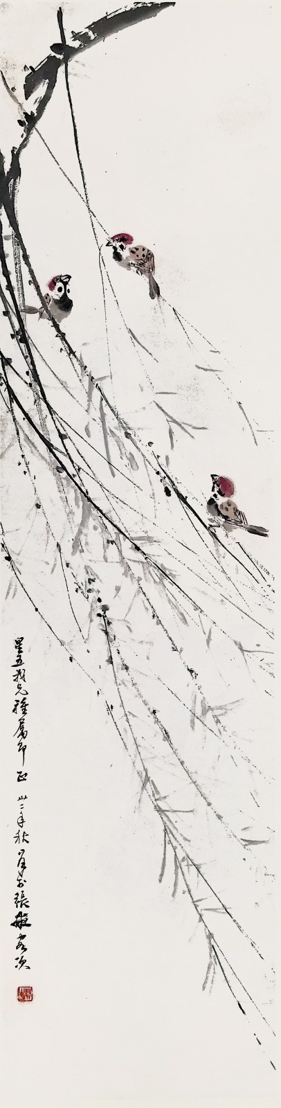 1939年秋,關(guān)山月踏上旅行寫生之路,他自廣東出發(fā),踏遍西南,走進(jìn)西北,深入生活,收集素材,邊寫生邊創(chuàng)作,這段旅途為他後來的藝術(shù)成就奠定了堅(jiān)實(shí)的基礎(chǔ)?!读浮穭?chuàng)作於1943年,旅途的寫生見聞令他開闊了眼界,他秉承恩師高劍父「折衷中西,融匯古今」的藝術(shù)主張,繼承了中國寫意畫以水墨為主的風(fēng)格,借鑒古代壁畫中人物畫的技法,同時吸收了西畫的寫實(shí)手法。畫中的柳條纖細(xì)柔韌,線條細(xì)如游絲,剛勁如鐵線,有高古之意;遠(yuǎn)處的枝條用淡墨帶出,層次豐富,有強(qiáng)烈的空間感。枝頭的麻雀以水墨表現(xiàn)為主,幾筆暈染出麻雀蓬鬆的羽毛和圓潤靈巧的身體,白色羽毛的部位留白處理,羽翼邊沿稍作勾勒,造型靈動自然。他在注重傳統(tǒng)寫意畫「傳神達(dá)意」的同時,採用了西畫中的焦點(diǎn)透視,麻雀在俯仰之間結(jié)構(gòu)透視隨之變化,營造出一種空間的真實(shí)感。此作品畫面雖簡潔,但細(xì)節(jié)處耐人尋味,有很強(qiáng)的感染力,可謂神完氣足。