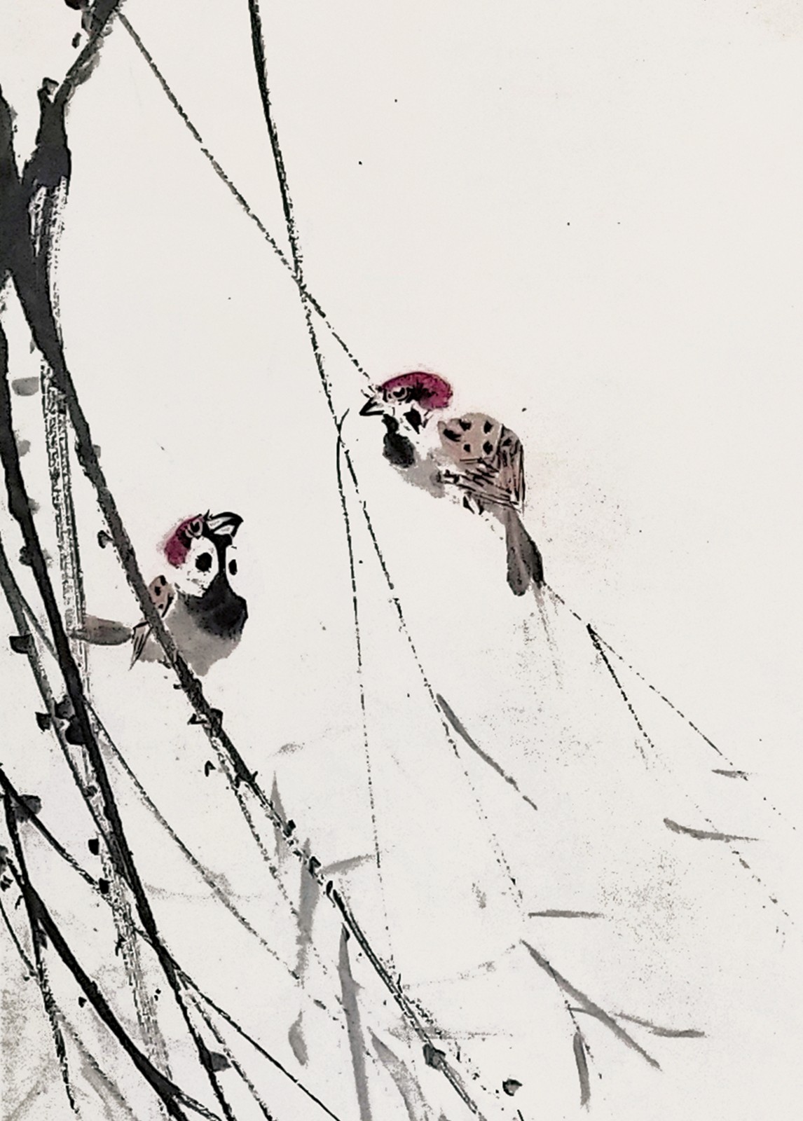 關(guān)山月在藝術(shù)上堅(jiān)持嶺南畫派的革新主張,追求畫面的時代感和生活氣息。麻雀是花鳥畫中常見的鳥類,它顏色樸素,又有斑紋,可謂文質(zhì)皆備,雅俗共賞。名家筆下的麻雀風(fēng)格各異:徐悲鴻樸實(shí)無華,唐雲(yún)冷峭靈奇,齊白石爐火純青。而關(guān)山月筆下的麻雀生動可愛,造型簡練,色彩鮮豔,情態(tài)各異。麻雀頭部的那一抹紅色分外耀眼,仿佛俏麗的帽子。頸部有一圈白色的羽毛,喙部下方一道黑色的帶狀花紋和腹部相連,兩側(cè)分別有一塊黑色的圓形斑紋。腹部的羽毛是較淺的灰色,尾羽高高翹起,盡顯活潑靈動。