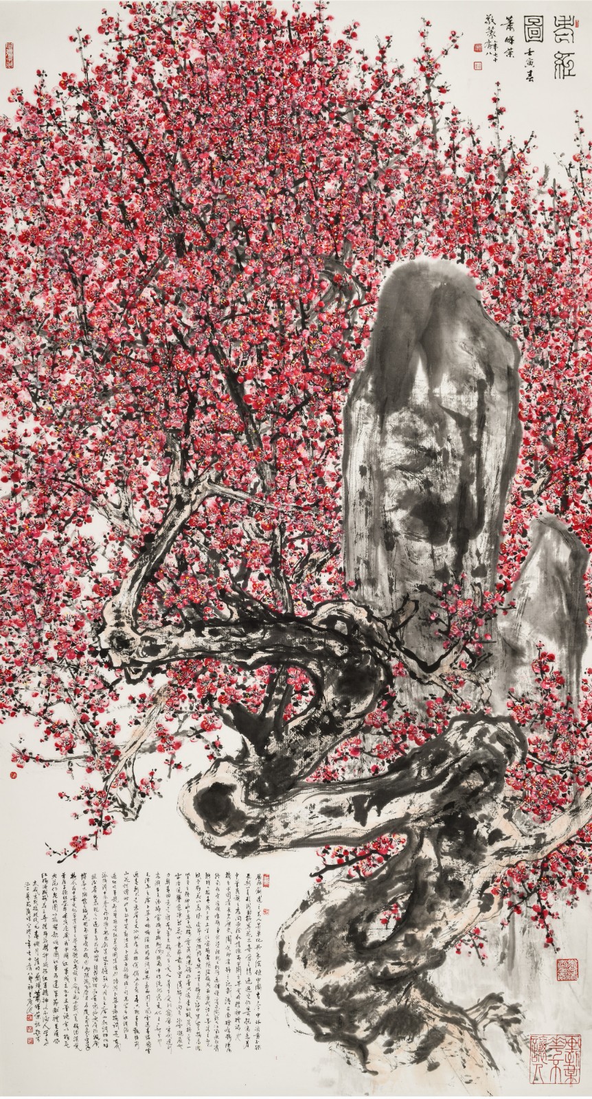 蕭暉榮作品《梅花三弄之紅梅頌》, 設(shè)色紙本,153x83cm,2022年。