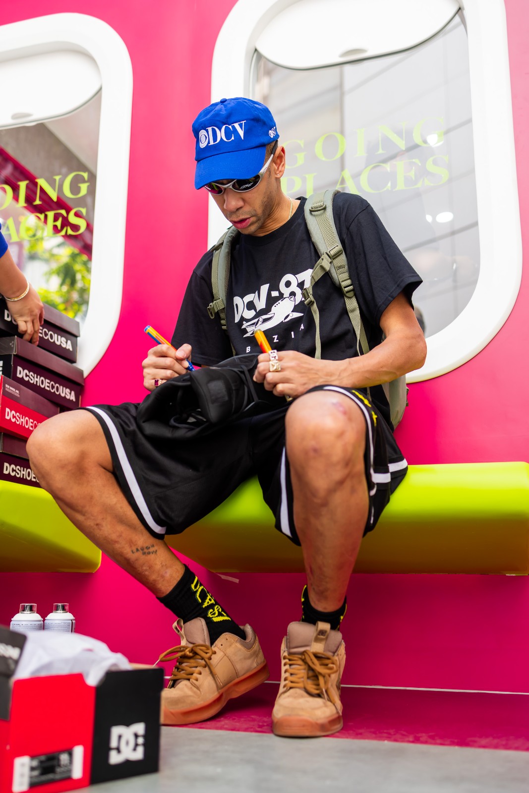 Lucien Clarke滑板技術(shù)不俗,加上極高時尚藝術(shù)觸覺,經(jīng)常成為各大奢侈品牌及潮牌爭相合作的領(lǐng)行人。先後成為歐洲頂級潮牌Palace及美國DC Shoe的創(chuàng)意總監(jiān),及後獲國際奢侈品品牌Louis Vuitton時任男裝創(chuàng)意總監(jiān)Virgil Abloh邀請,聯(lián)手打造166年歷史上首款滑板鞋。早前Lucien再度獲邀參與Gucci聯(lián)乘Palace推出的系列創(chuàng)作。2019年Lucien創(chuàng)立獨立潮牌DCV’87,深受潮人及街頭文化愛好者追捧。是次快閃店其自家品牌進駐商場,以貨櫃外形為主體設(shè)計配合飛機窗與主題店舖“GOING PLACES”呼應(yīng),以街頭水泥牆及地板作為裝飾主軸,再配以顏色鮮豔的陳列櫃產(chǎn)生對比,凸顯出街頭文化中奔放自由的態(tài)度。