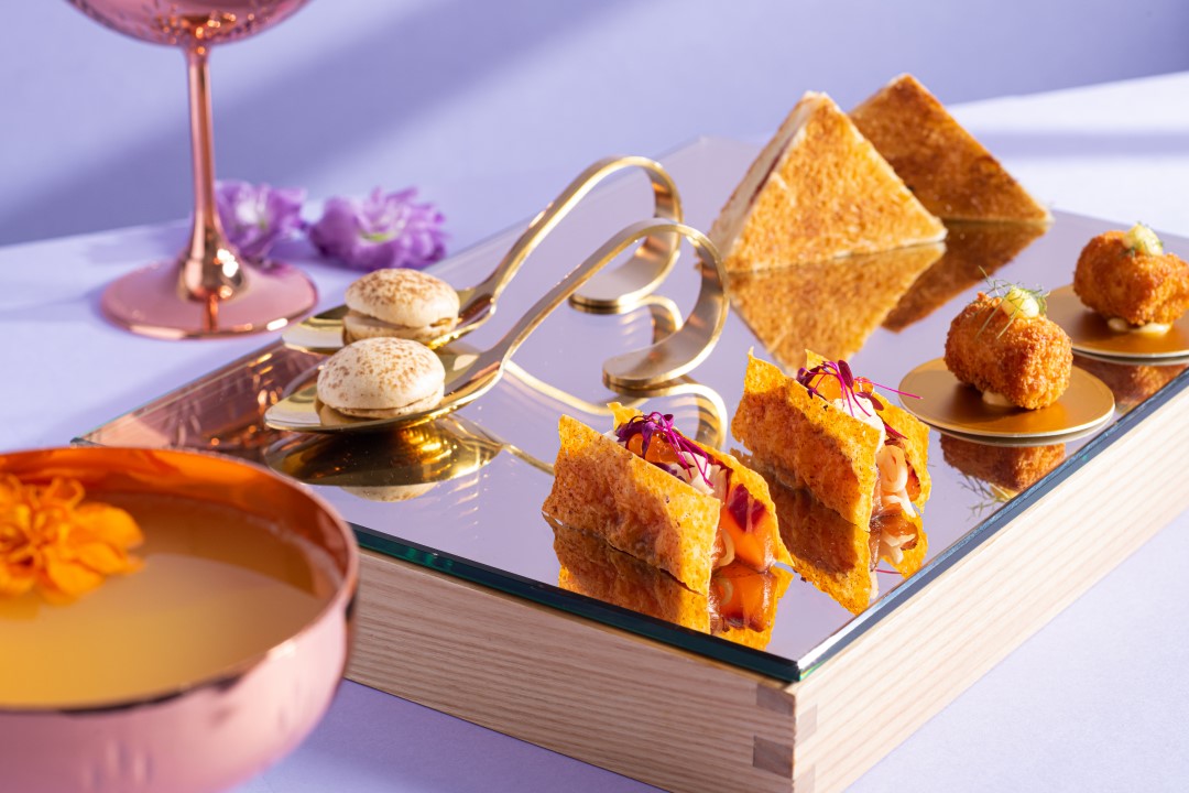 餐廳總廚James Oakley為「紫綴金炫」煥肌下午茶套餐設(shè)計(jì)了多款可口小食,先以紫甘藍(lán)醃三文魚配西芹頭沙律及烤薄脆餅乾掀開序幕,從紫甘藍(lán)的天然色素取其紫色,再以?shī)A心三層的方式設(shè)計(jì)。外形像一朵蘑菇的森林蘑菇馬卡龍,配上香氣滿溢的野菌醬汁,味道有驚喜。炸至金黃香脆的加拿大龍蝦可樂(lè)餅,鮮味彈牙,而白毛豬火腿曼徹格芝士多士烘得酥脆可口。