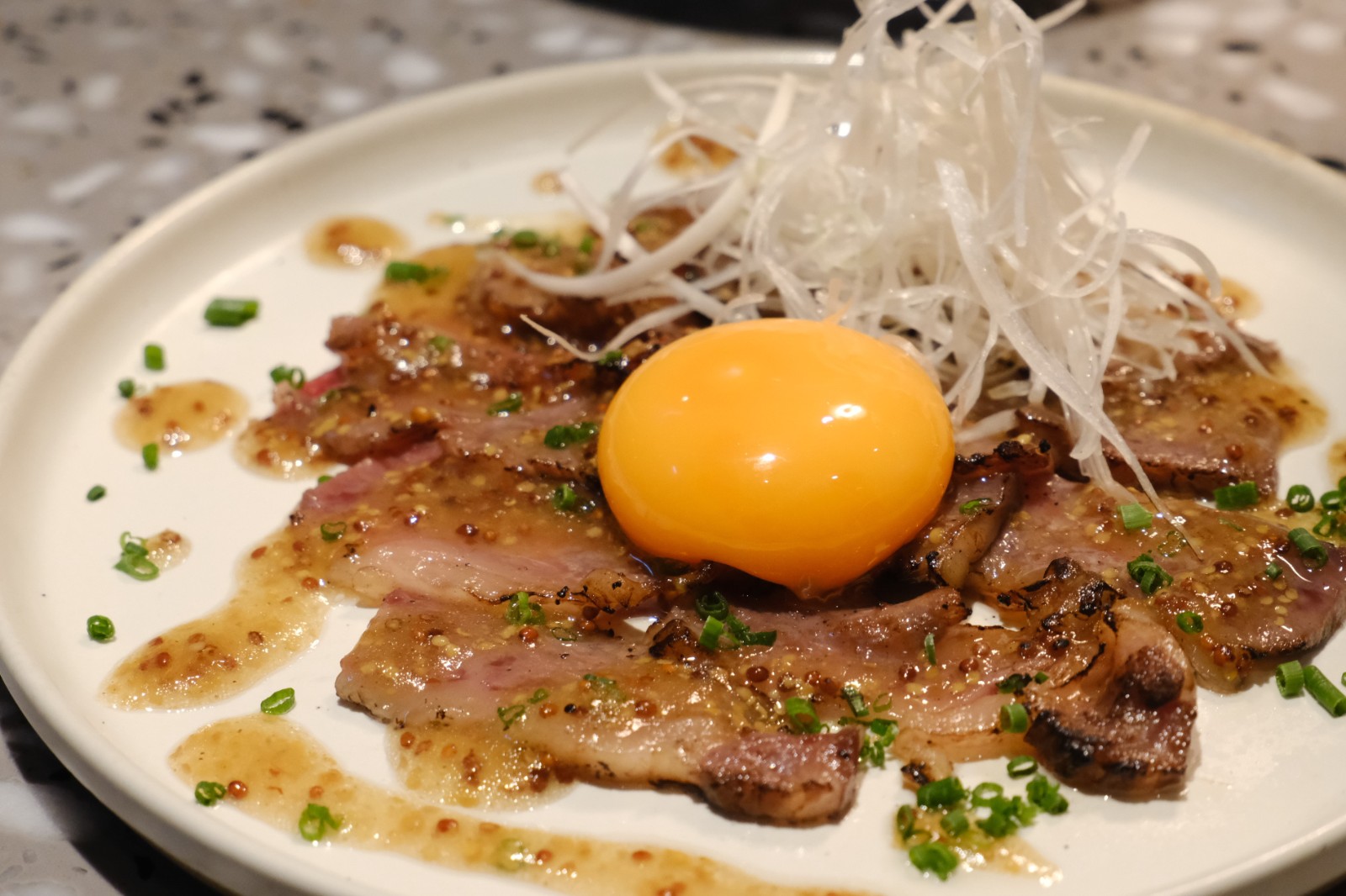 鹿兒島和牛薄切,HK$278。牛肉蘸上生蛋黃享用,並配上由芥末籽特調(diào)而成的醬汁和香蔥,提升和牛的味道層次。