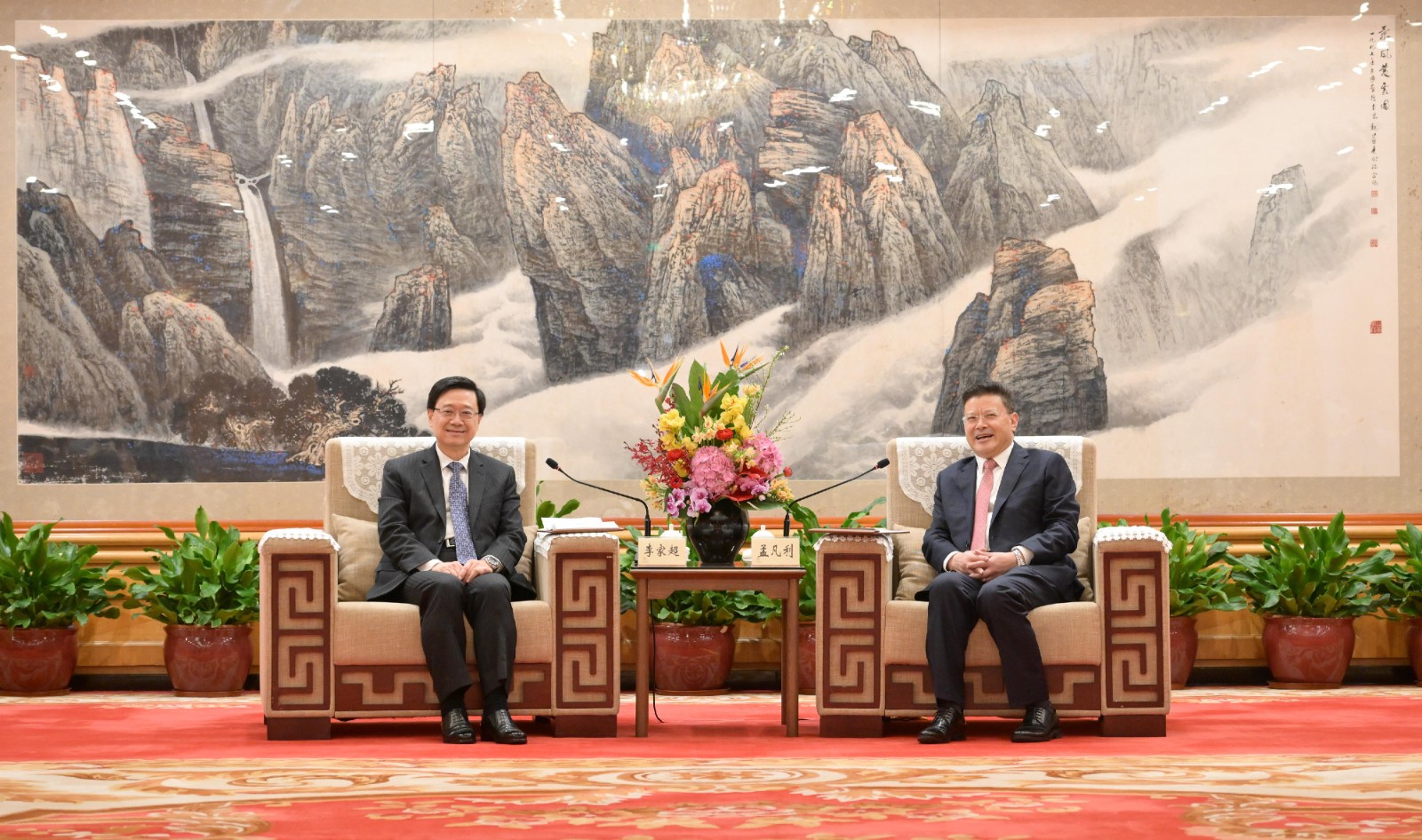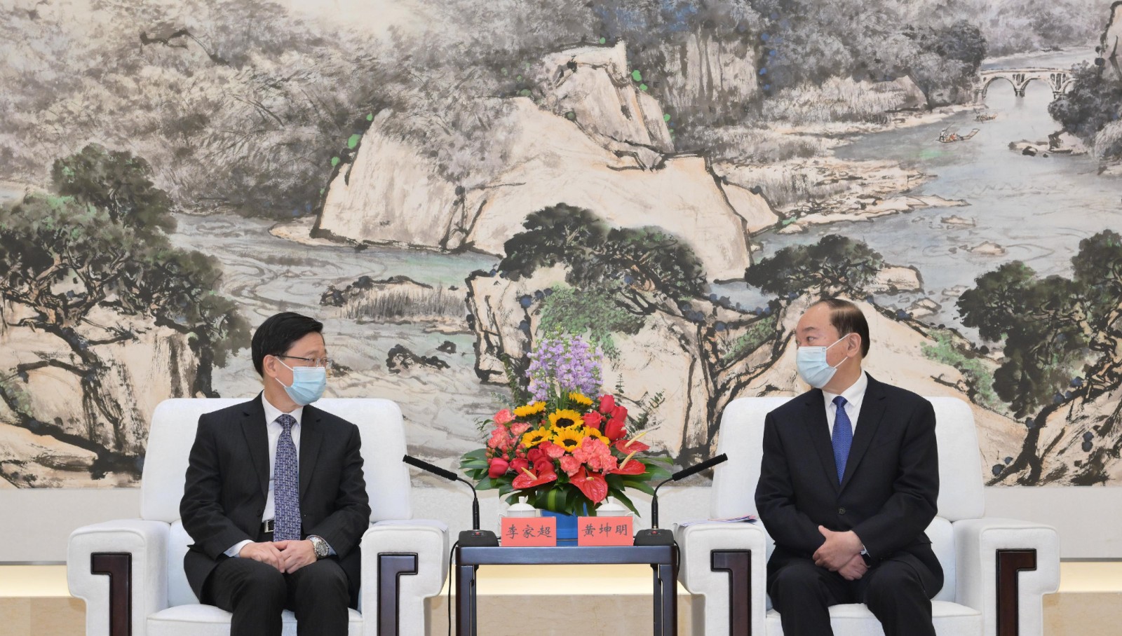 李家超(左)在廣州與廣東省委書記黃坤明(右)會面。