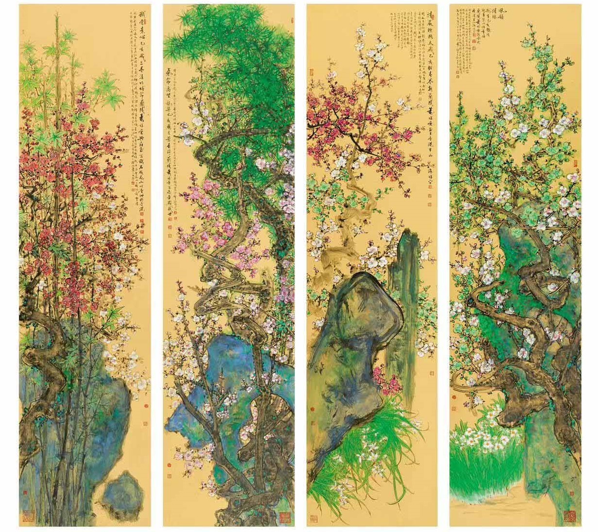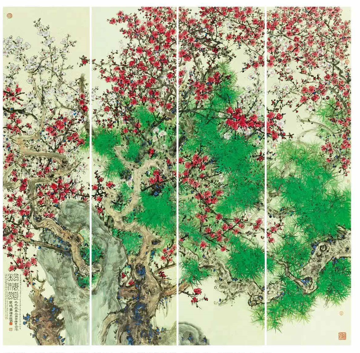 蕭暉榮作品《松梅頌》(四屏通景),設(shè)色淡黃蠟染箋,2019年,138×34.5厘米×4。