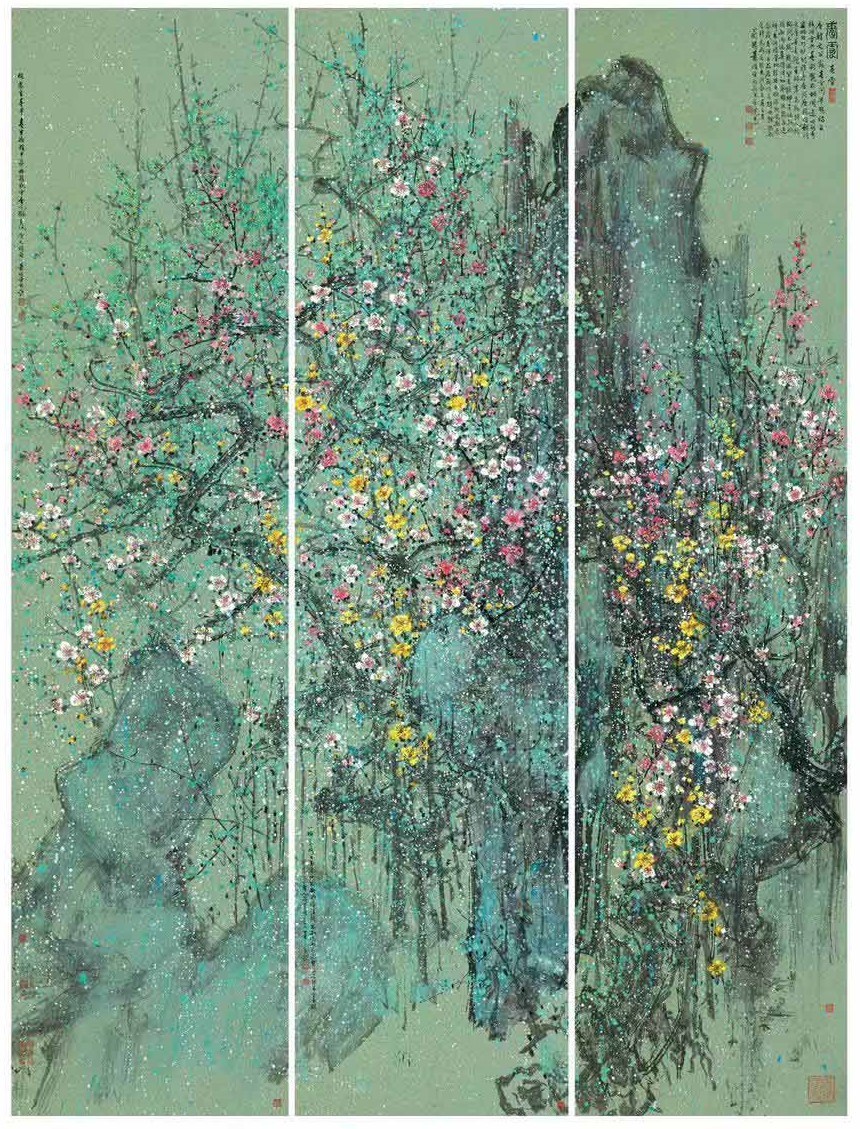 蕭暉榮作品《春雪》(三屏通景),設(shè)色綠蠟染箋,2019年,138×34.5厘米×3。