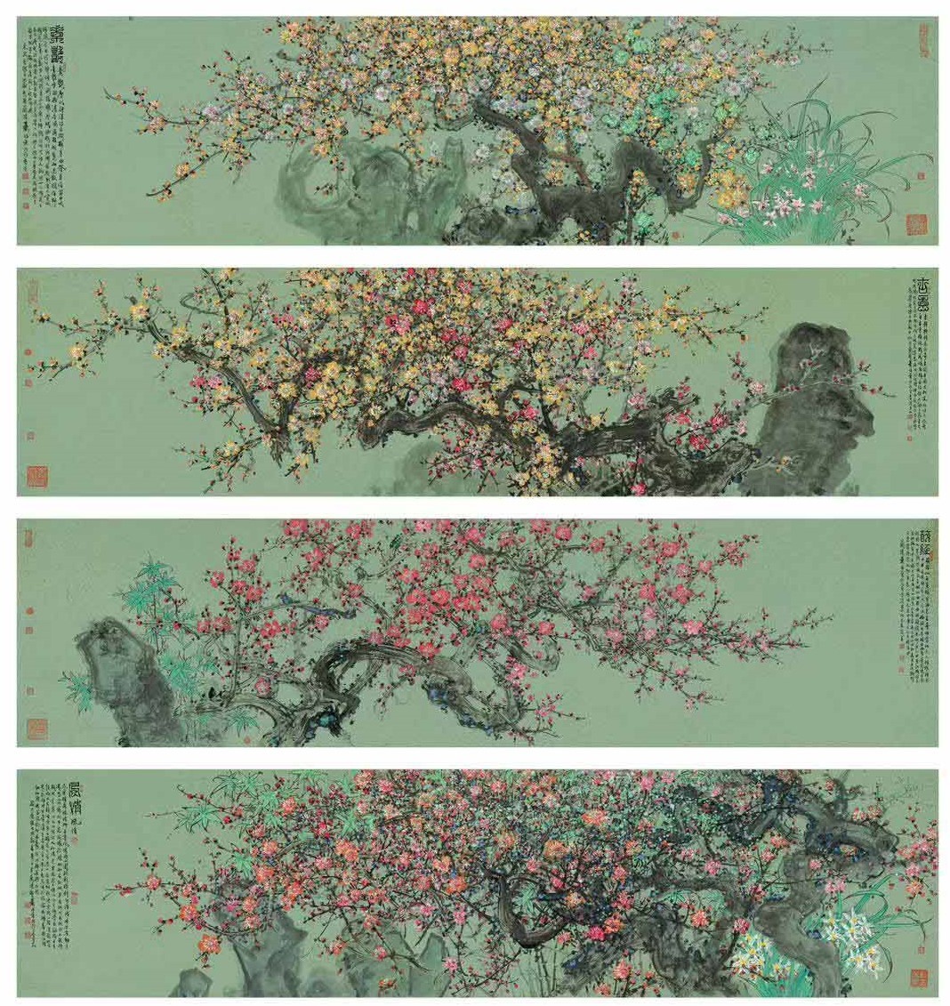 蕭暉榮作品《素豔》、《古意》、《醉紅》、《風(fēng)情》,設(shè)色綠蠟染箋,2019年,各34.5×138厘米。
