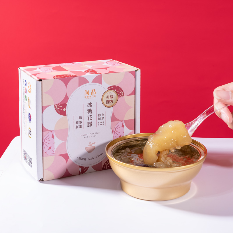 品牌推出的即食花膠有冰糖和酒釀兩款口味,採(cǎi)用日本「高溫高壓滅菌技術(shù)」,無(wú)需放雪櫃。前者內(nèi)含2至3隻深?;z,肉厚Q彈,還有紅棗、藜麥等健康食物,味道清甜,養(yǎng)陰生津,補(bǔ)腎、潤(rùn)肺止咳,美顏健脾,兼可提升皮膚彈性及水份;後者內(nèi)含花膠、桂圓乾、枸杞等健康食物,口感豐富,配以米酒釀成,更滋補(bǔ)養(yǎng)顏。燕窩飲品亦有冰糖和花旗參兩款,採(cǎi)用了馬來(lái)西亞燕窩,含豐富的膠原蛋白及氨基酸,冰糖味口感香甜幼滑,啖啖燕絲,潤(rùn)肺補(bǔ)氣?;ㄆ靺⑽赌芨纳破跔顟B(tài),養(yǎng)氣補(bǔ)氣,味道甘香,營(yíng)養(yǎng)價(jià)值高。