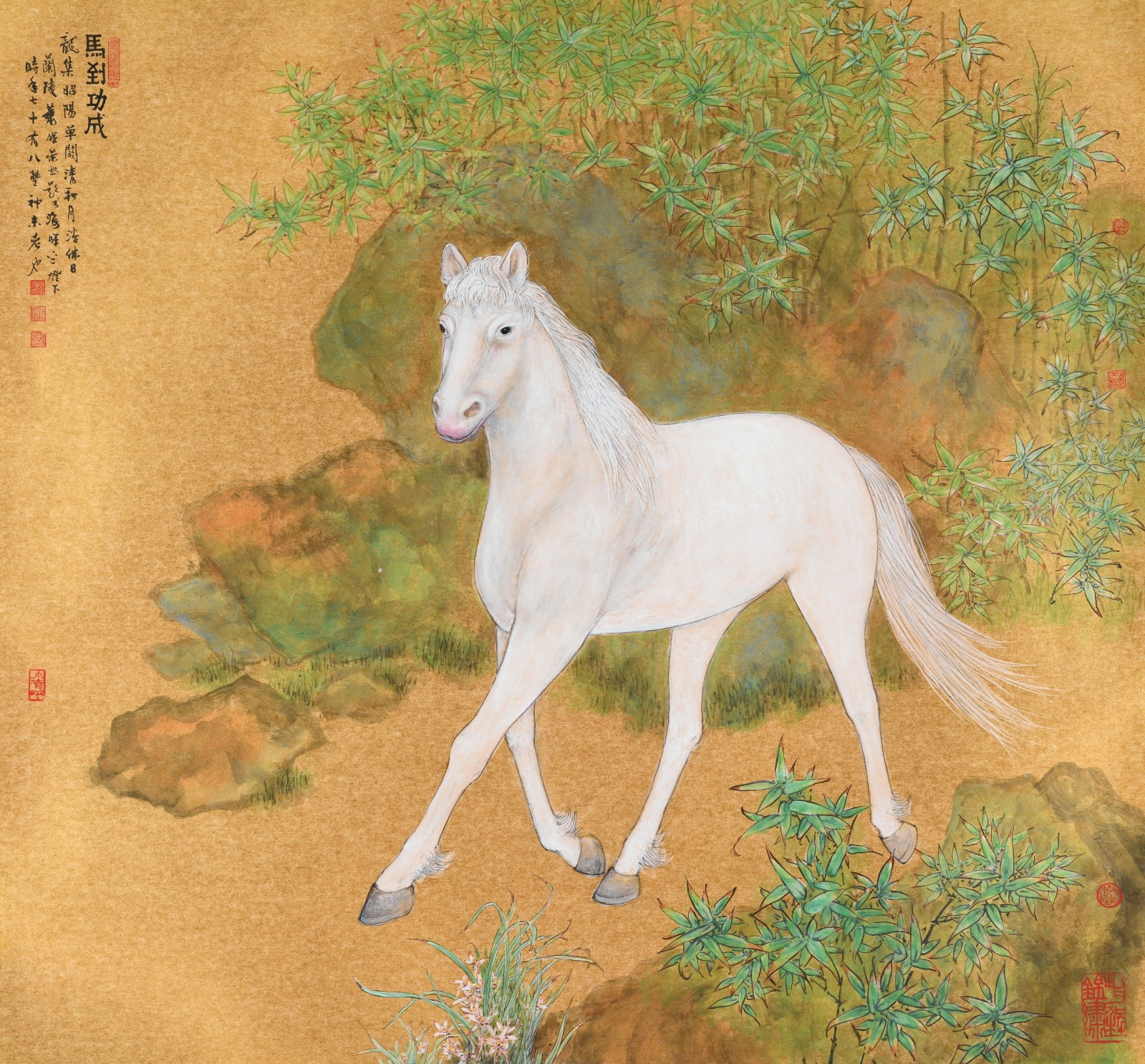 蕭暉榮作品《馬到功成》,設(shè)色金箋,2023年,103×110cm。