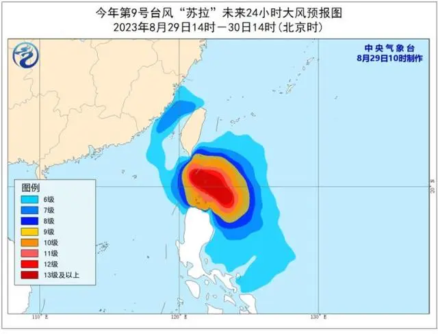 另?yè)?jù)中央氣象臺(tái)網(wǎng)站消息,中央氣象臺(tái)8月29日10時(shí)發(fā)布颱風(fēng)藍(lán)色預(yù)警:今年第9號(hào)颱風(fēng)「蘇拉」(SAOLA)(強(qiáng)颱風(fēng)級(jí))的中心今日(29日)上午8時(shí)位於臺(tái)灣鵝鑾鼻東南方向大約460公里的海面上,就是北緯18.6度、東經(jīng)123.5度,中心附近最大風(fēng)力有14級(jí)(45米/秒),中心最低氣壓為950百帕,七級(jí)風(fēng)圈半徑220-250公里,十級(jí)風(fēng)圈半徑80-90公里,十二級(jí)風(fēng)圈半徑50公里。