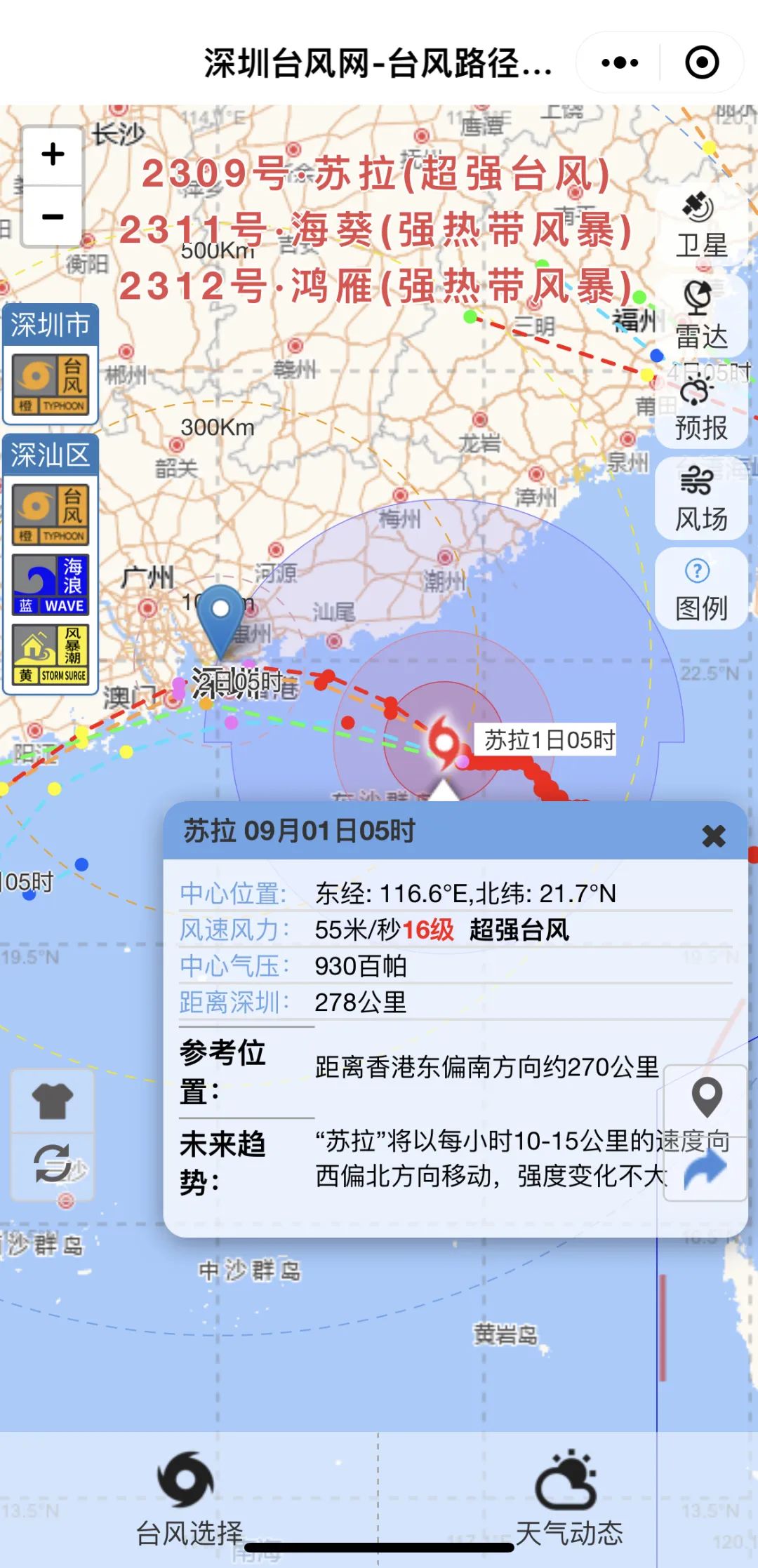 今年第9號颱風(fēng)「蘇拉」(超強(qiáng)颱風(fēng)級)9月1日06時位於深圳東南方約268公里的海面上,中心附近最大風(fēng)力16級(55米/秒),中心最低氣壓930百帕。
