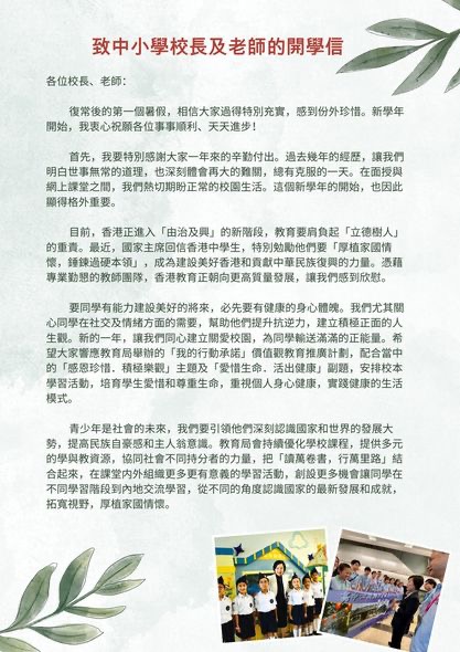 教育局局長(zhǎng)蔡若蓮今日(2日)在社交平臺(tái)上載兩封分別致中小學(xué)校長(zhǎng)及老師與幼稚園校長(zhǎng)及老師的開(kāi)學(xué)信,祝願(yuàn)各位事事順利、天天進(jìn)步。