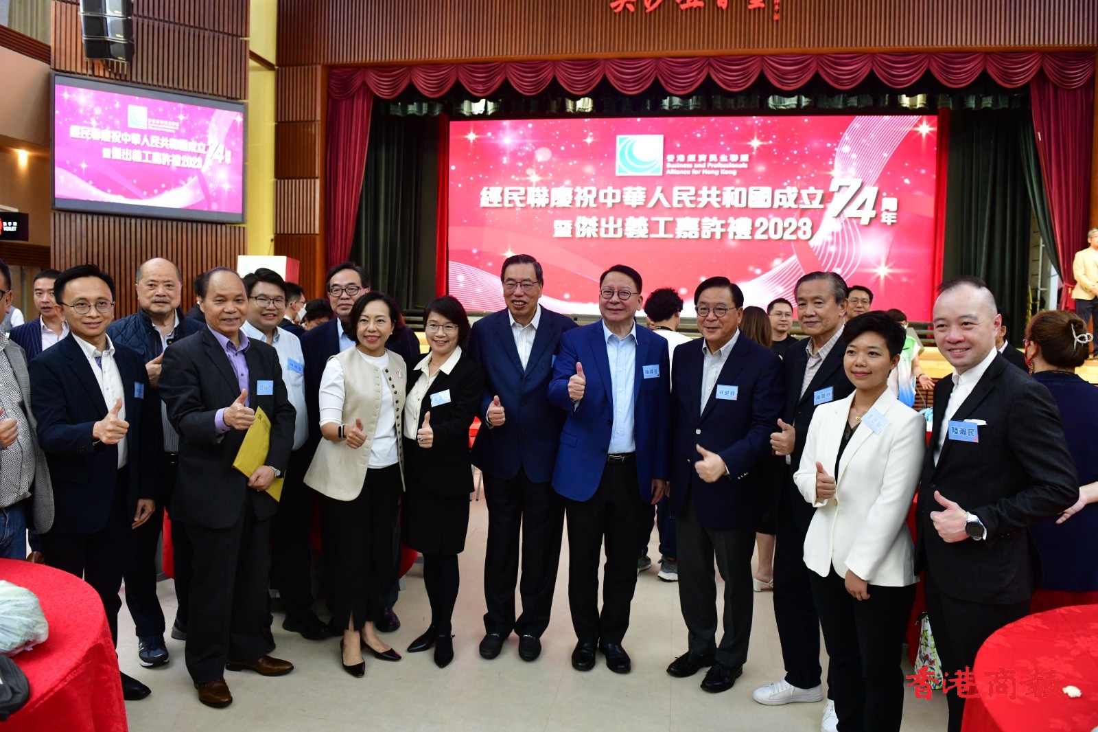 出席嘉許禮的嘉賓還有民政及青年事務(wù)局局長(zhǎng)麥美娟、中聯(lián)辦港島工作部副部長(zhǎng)王卉、中聯(lián)辦九龍工作部副部長(zhǎng)李文彬、中聯(lián)辦協(xié)調(diào)部處長(zhǎng)潘俊、香港島各界聯(lián)合會(huì)理事長(zhǎng)蘇長(zhǎng)榮、九龍社團(tuán)聯(lián)會(huì)理事長(zhǎng)徐莉、立法會(huì)議員梁文廣、多區(qū)民政事務(wù)專(zhuān)員。經(jīng)民聯(lián)榮譽(yù)主席梁君彥,主席盧偉國(guó),副主席林健鋒,副主席、地區(qū)事務(wù)委員會(huì)主席梁美芬,副秘書(shū)長(zhǎng)、青委會(huì)主席陸瀚民,監(jiān)事會(huì)副主席張華峰以及多個(gè)社團(tuán)代表、地區(qū)領(lǐng)袖等,聯(lián)同來(lái)自全港各區(qū)的街坊、義工及友好共500多人,一同參加嘉許禮並祝賀國(guó)慶74周年。(記者:李銘欣 攝影:崔俊良)