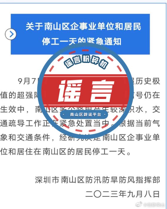 9月8日上午,「創(chuàng)新南山」官方微博發(fā)布一則闢謠稱:9月8日,網絡流傳一則「關於深圳南山區(qū)企事業(yè)單位和居民停工一天的緊急通知」。經核實,該消息屬於網絡謠言。大家心情可以理解,謠言不可亂傳!