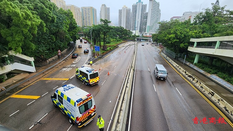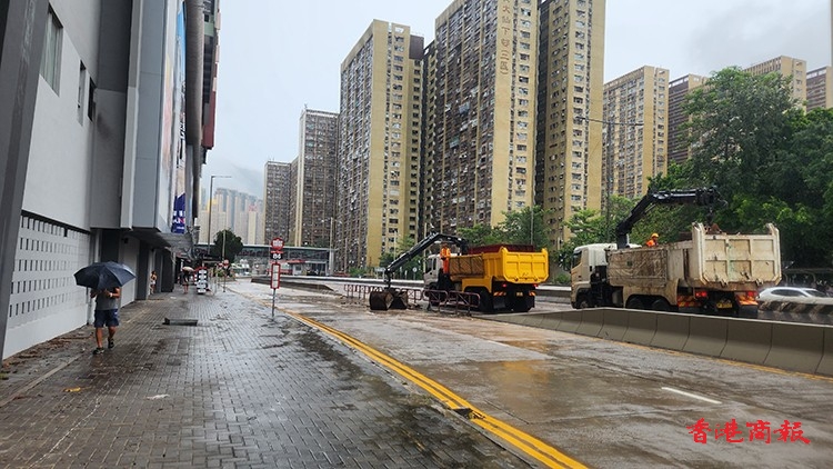 黃大仙龍翔道往觀塘方向行車線仍然封閉,當局派出泵水抽水,消防人員到場戒備。