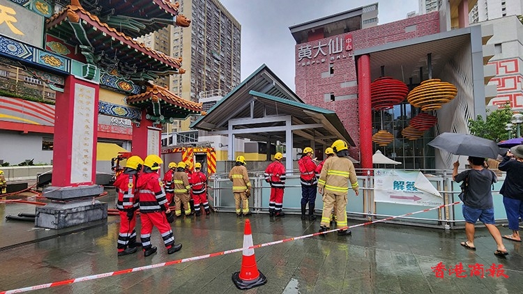 據(jù)了解,大量黃泥水是由商場旁邊的黃大仙祠對出廣場斜路湧入該處低窪地帶,連帶將「洪水」衝入港鐵站內(nèi)。目前,當局調(diào)動3輛泵車到場吸走積水,惟仍需一段時間。另一方面,在黃大仙中心北館其他沒有被波及的樓層,就聚集大批街坊和市民在圍觀仿如「水舞間」的商場地庫層,也有人持手機直播或「打卡」。也有街坊笑稱該處已變成「黃大仙下邨游泳池」。(記者/攝影:何家驊)