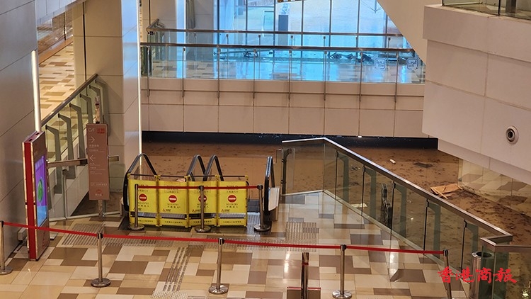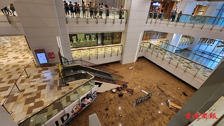 黃大仙中心北館地庫層水浸近乎沒頂,大批市民在商場內(nèi)圍觀和「打卡」。