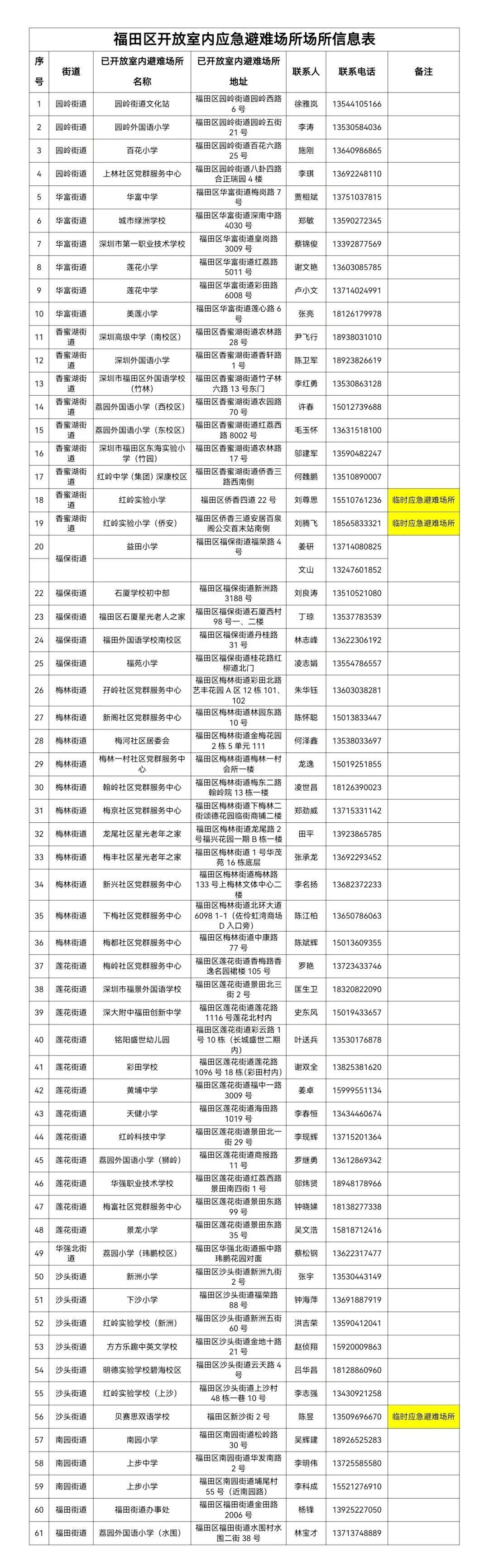 目前,福田區(qū)共開放了58個(gè)室內(nèi)應(yīng)急避難場所和3個(gè)臨時(shí)室內(nèi)應(yīng)急避難場所(詳見:福田區(qū)開放室內(nèi)應(yīng)急避難場所信息表)。有需要的群眾,可根據(jù)表中信息自行前往就近的室內(nèi)應(yīng)急避難場所避難。