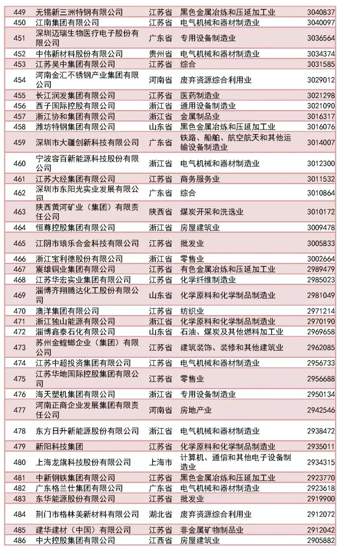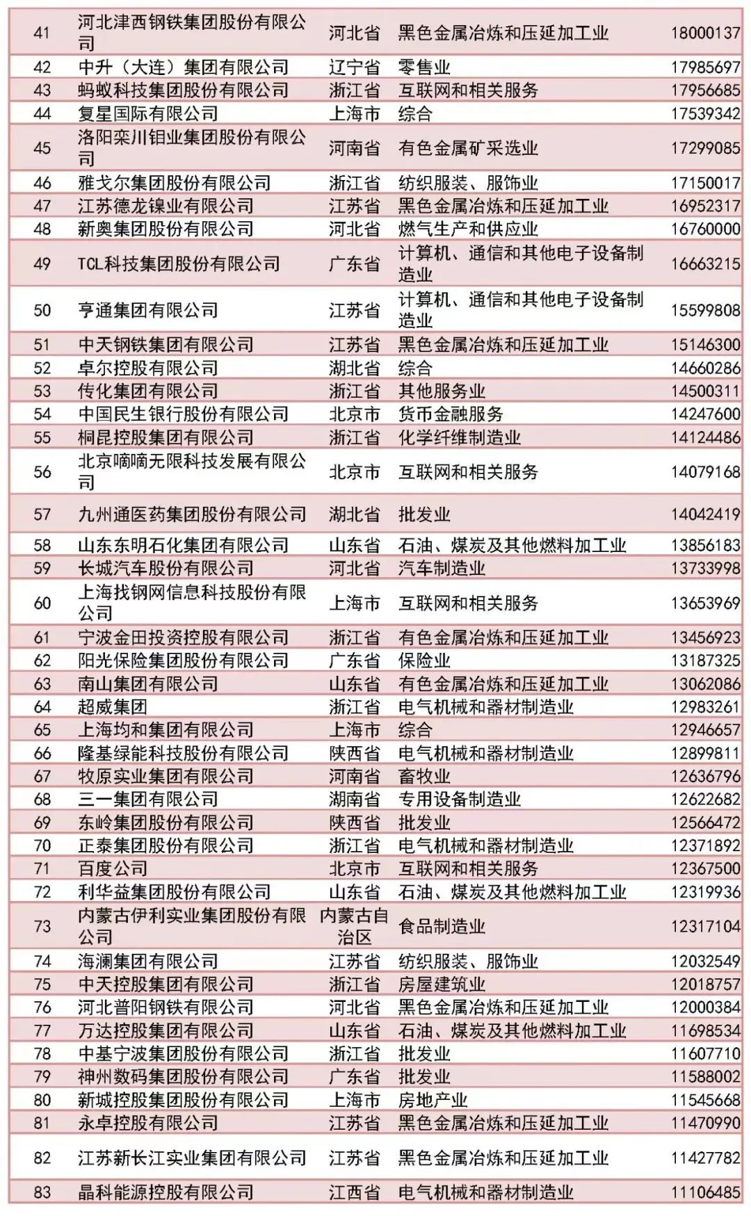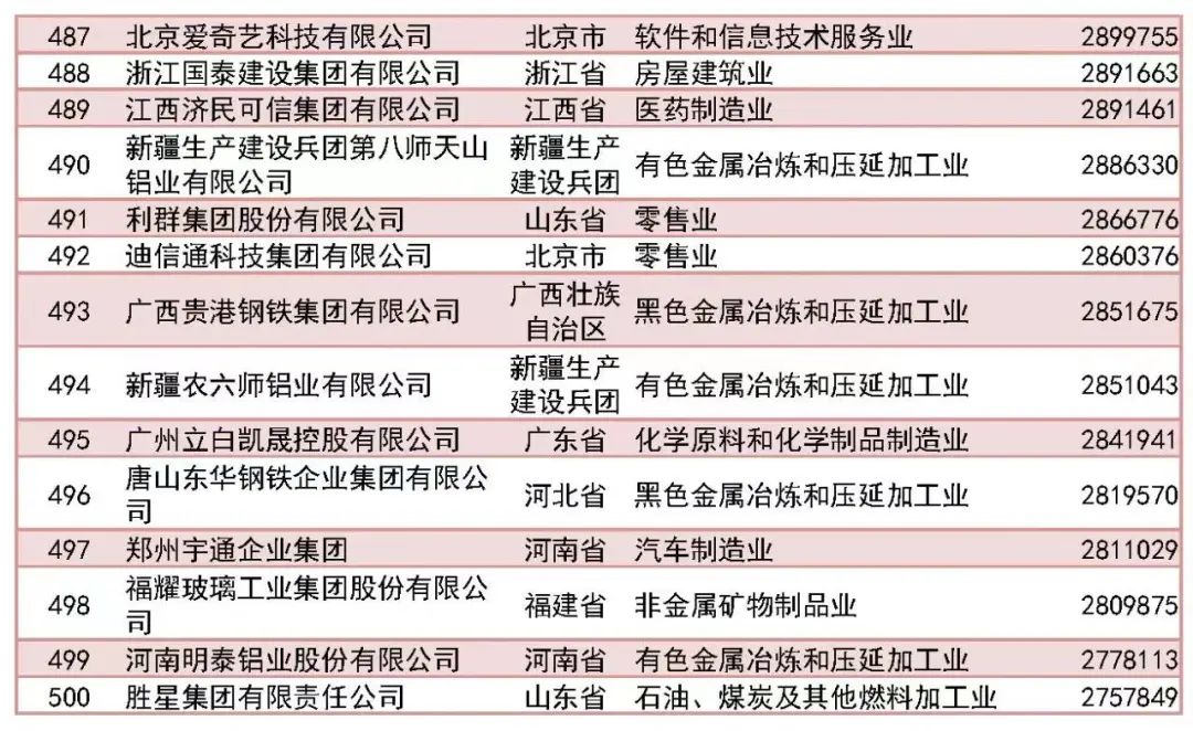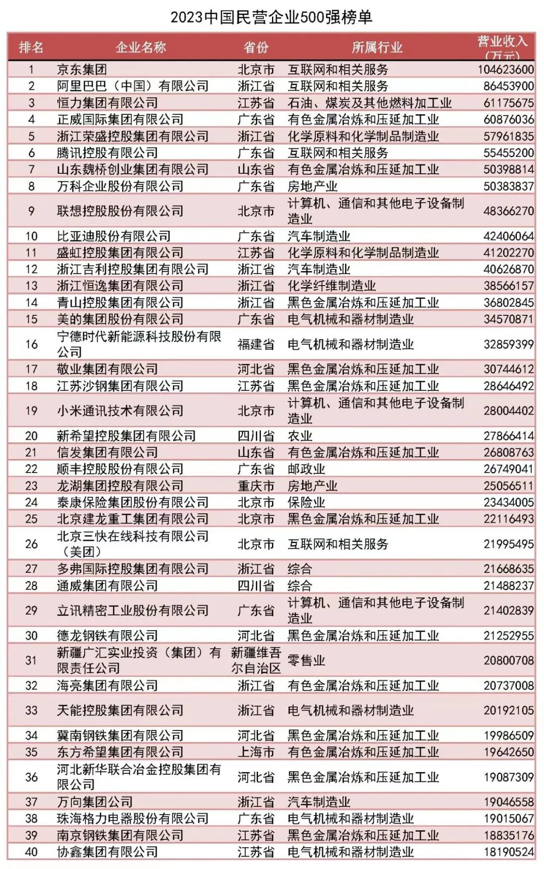 「2023中國民營企業(yè)500強」榜單前十名分別為:京東集團、阿里巴巴(中國)有限公司、恒力集團有限公司、正威國際集團有限公司、浙江榮盛控股集團有限公司、騰訊控股有限公司、山東魏橋創(chuàng)業(yè)集團有限公司、萬科企業(yè)股份有限公司、聯(lián)想控股股份有限公司、比亞迪股份有限公司。