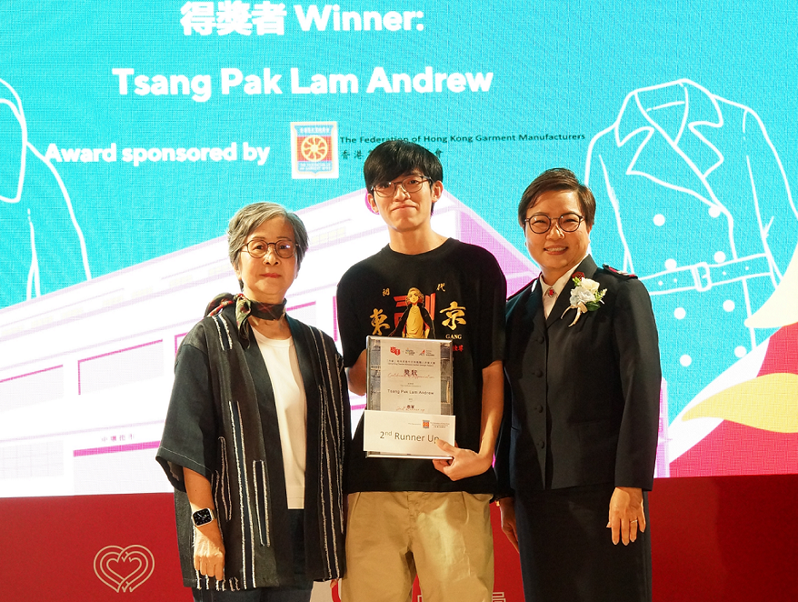 青年學(xué)院職專(zhuān)文憑(時(shí)裝)學(xué)生曾柏霖(中)製作的牛仔外套在網(wǎng)上票選成為「『升級(jí)』再造牛仔和風(fēng)職人外套大賞」的季軍,獲救世軍港澳地域內(nèi)閣業(yè)務(wù)行政部長(zhǎng)羅惠芳(右)在表演當(dāng)晚頒發(fā)獎(jiǎng)項(xiàng)。