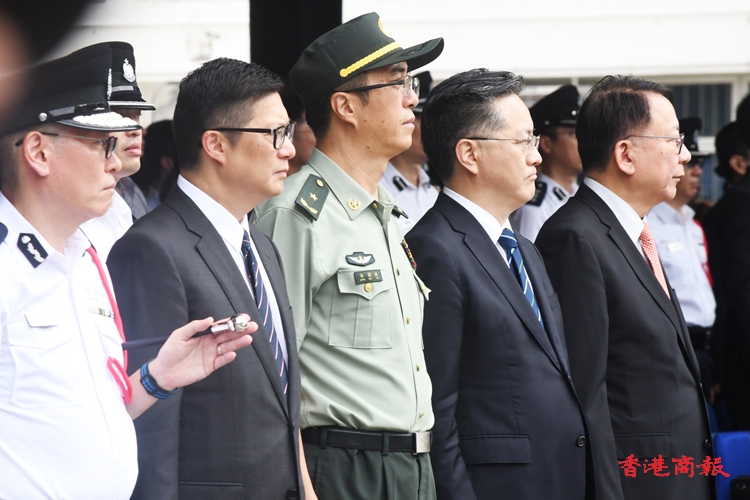 香港警察學院今日(16日)舉行結(jié)業(yè)會操,中央政府駐港聯(lián)絡(luò)辦主任鄭雁雄出席並擔任檢閱官。政務(wù)司司長陳國基、中央駐港國安公署副署長李江舟、解放軍駐港部隊副司令員鄭國躍、保安局局長鄧炳強、警務(wù)處處長蕭澤頤等出席了儀式。