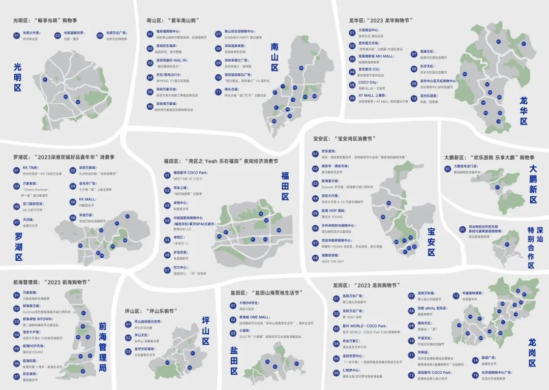 「2023深圳購(gòu)物季」由深圳市人民政府主辦,深圳市商務(wù)局等單位承辦,以「消費(fèi)點(diǎn)亮美好生活」為主題按照「1+3+3+12+12+19+N」的體系開(kāi)展為期3個(gè)月的系列促消費(fèi)活動(dòng),打造3大月度主題活動(dòng),聚焦12大消費(fèi)熱點(diǎn),開(kāi)展12場(chǎng)「一區(qū)一節(jié)」活動(dòng),聯(lián)動(dòng)各區(qū)核心商圈打造19個(gè)市級(jí)重點(diǎn)活動(dòng)IP,正式拉開(kāi)下半年全市促消費(fèi)活動(dòng)的大幕。