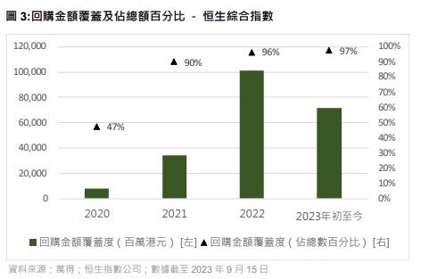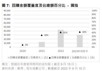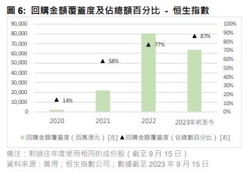 恒指公司續(xù)指,值得留意的是,此回購趨勢一直延續(xù)到今年,2023年初至今(截至9月15日),回購金額達735億元,佔去年全年總額的70%。簡單推斷,2023年度預計回購金額可能達到929億元,是前5年年度平均水平的3.9倍。此高水平的回購金額或能反映企業(yè)認為其在香港上市的股票在2022年和2023年初至今被低估,促使其在期內「逢低買入」。