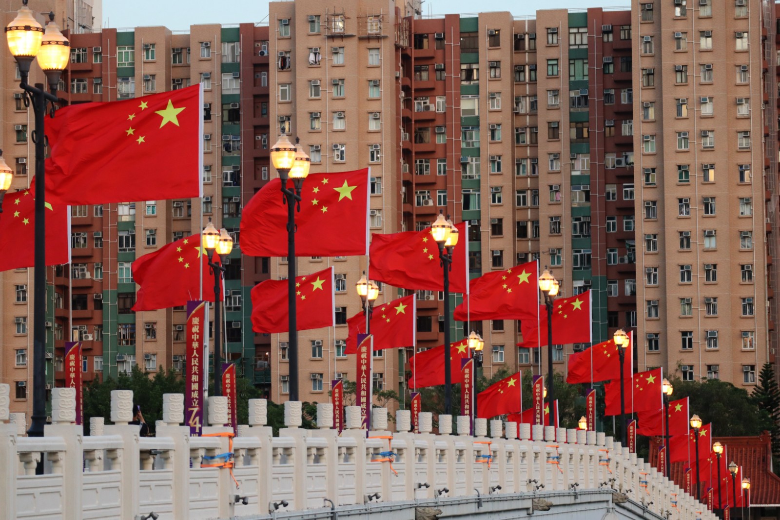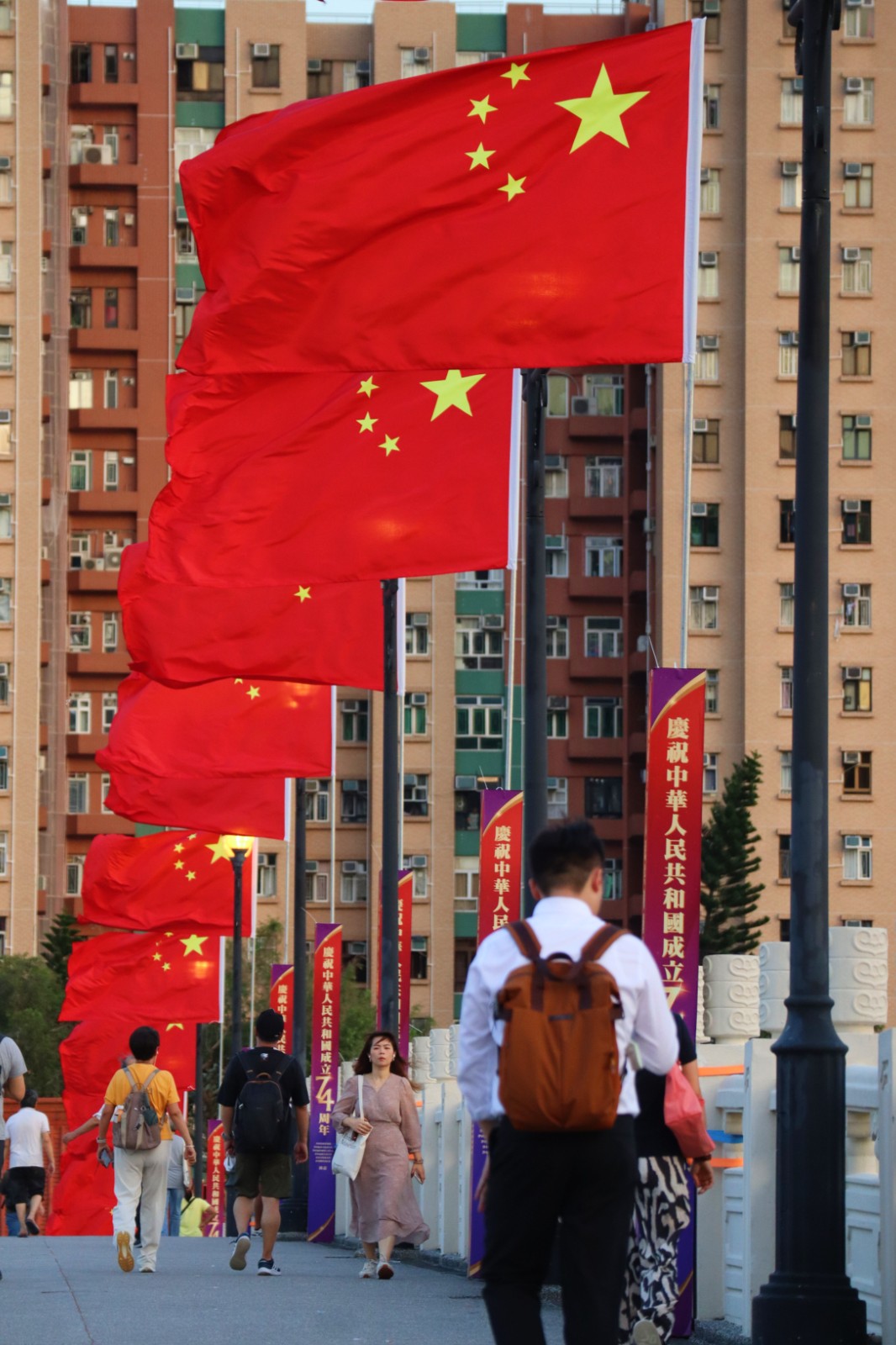 還有11天就是中華人民共和國(guó)成立74周年大日子,市面已有不少彩旗、橫幅等裝飾,以示慶祝。在沙田瀝源橋上插著數(shù)10支五星紅旗,旗海飄揚(yáng),在秋風(fēng)吹送下發(fā)出颯颯聲響,吸引不少市民駐足打卡。(馮瀚文攝)