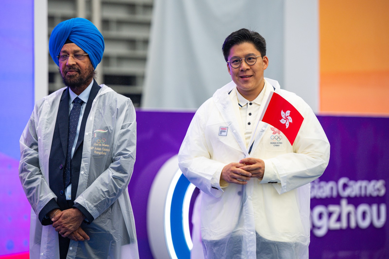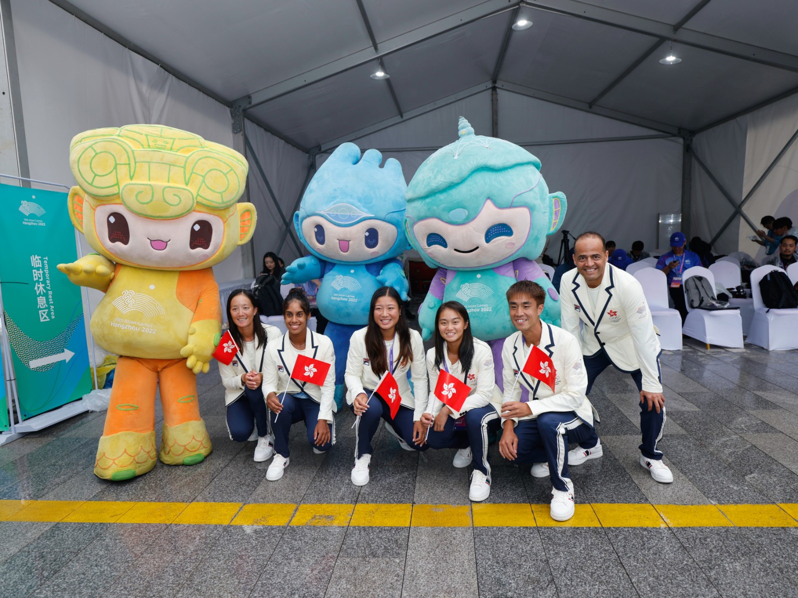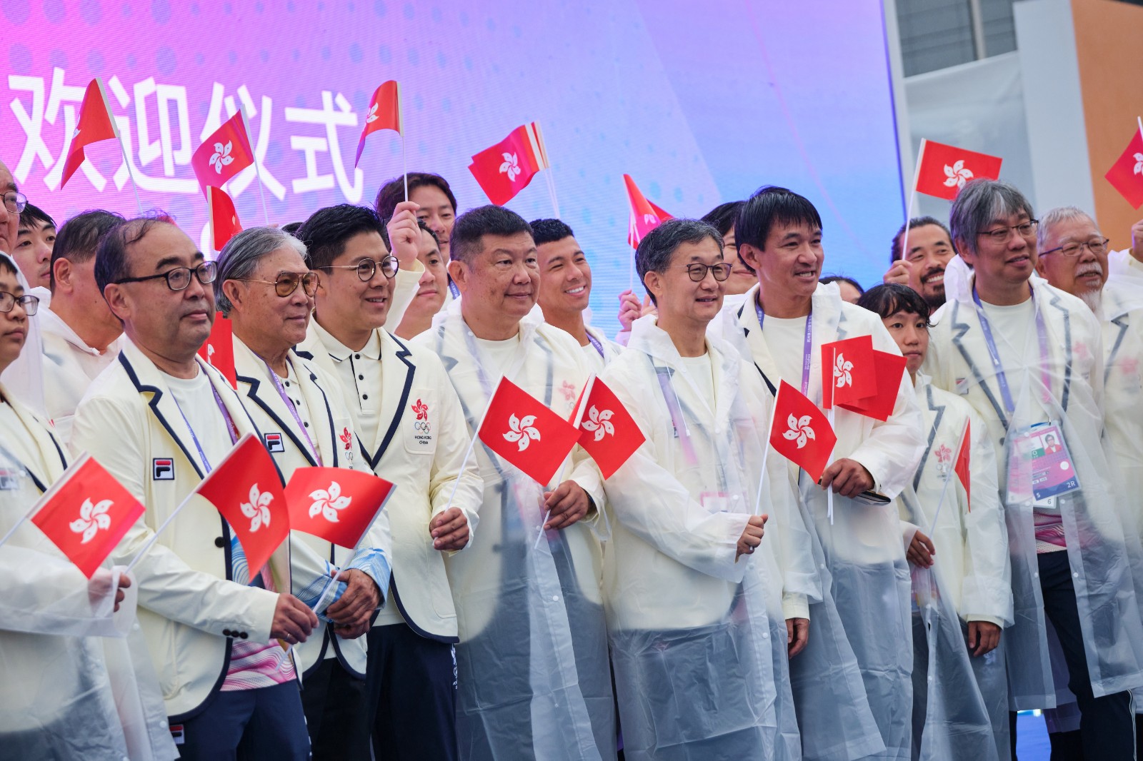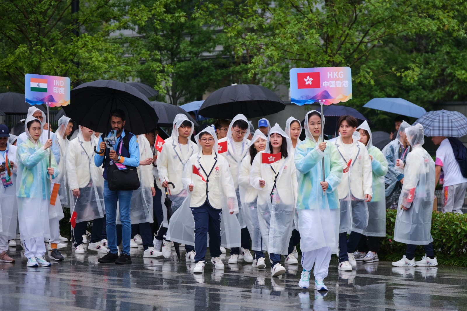 天公不美,儀式進(jìn)行期間一直下著微雨,港協(xié)暨奧委會(huì)人員及部分港隊(duì)運(yùn)動(dòng)員都有到場(chǎng),包括有拳擊的曹星如;網(wǎng)球的黃澤林、王康怡、王康傑;體操的吳翹充、黃曉盈等人,另外,單車名將黃金寶亦有出席,各人都是著笑容,手持並揮動(dòng)區(qū)旗進(jìn)場(chǎng),場(chǎng)面歡愉。