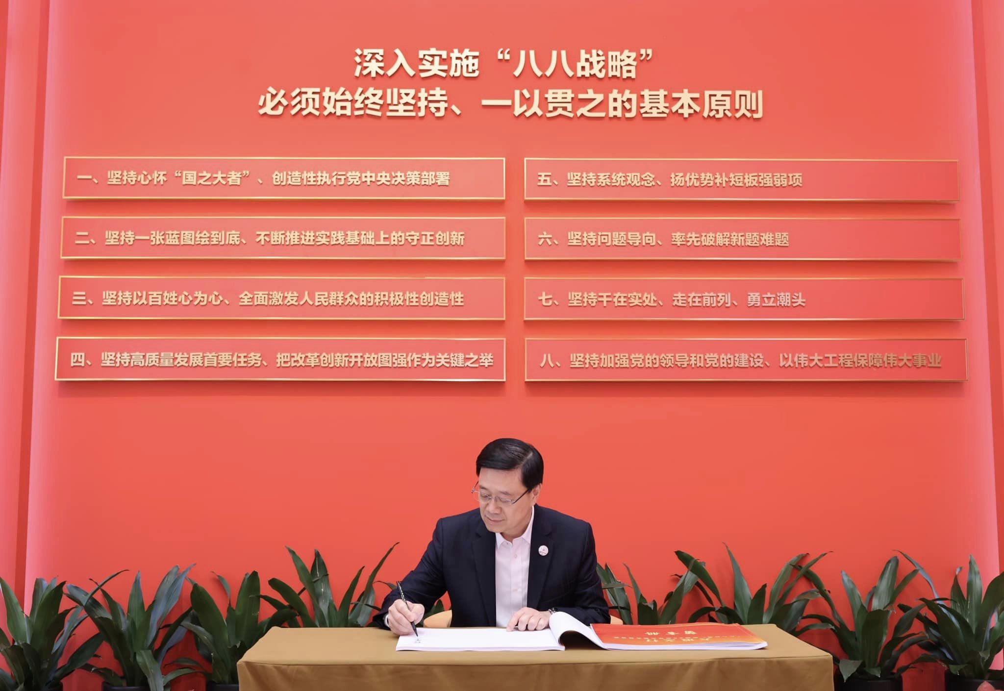 李家超其後發(fā)文表示,「八八戰(zhàn)略」是習(xí)近平主席於2003年時任浙江省委書記時提出的,總結(jié)了浙江發(fā)展的八個優(yōu)勢,並提出面向未來發(fā)展的八項舉措。展覽全方位及系統(tǒng)性地展示了在「八八戰(zhàn)略」指引下, 浙江經(jīng)濟(jì)社會在過去20年取得的巨大成就和突破,以及市民生活的變化等。