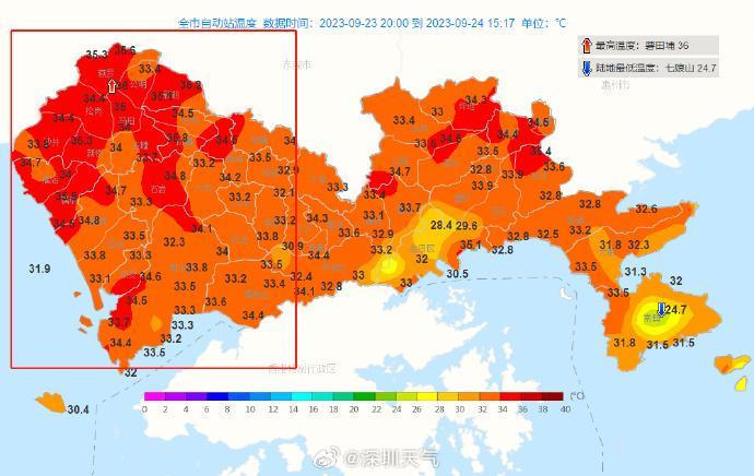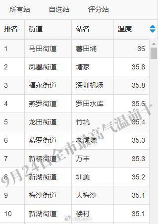 中秋臨近,深圳的夏天還在「超長待機」,昨天(9月24日),@深圳天氣 發(fā)布的當(dāng)天全市氣溫TOP10顯示,全市氣溫前十均超過35℃,「冠軍」由光明區(qū)馬田街道獲得(薯田埔站36℃)。