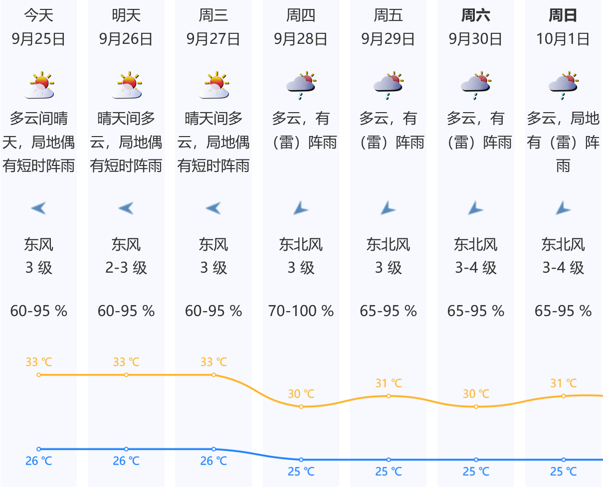 周一到周四(25-28日)多雲(yún)間晴天,間中有局地(雷)陣雨,中午前後天氣較熱;