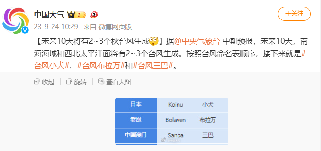 據(jù)@中央氣象臺 中期預(yù)報,今起10天南海海域和西北太平洋面將有2~3個颱風(fēng)生成。