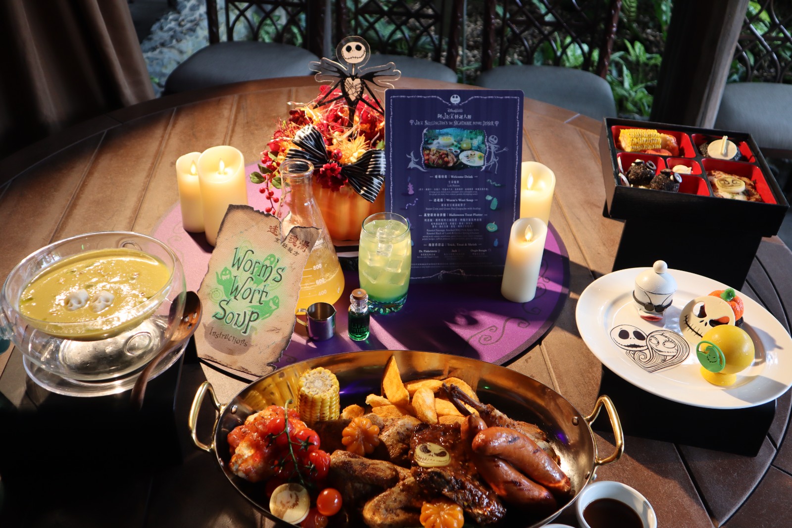 南瓜王阿Jack霸佔(zhàn)河景餐廳為賓客準(zhǔn)備了一場「驚」喜版阿Jack怪誕大餐,讓賓客品嘗到怪誕城的獨(dú)特美食。除了有科學(xué)怪人以獨(dú)特配方調(diào)製的迷魂湯,還有萬聖節(jié)美食拼盤、搗蛋系甜品、特飲等萬聖節(jié)限定美食,並有機(jī)會(huì)與阿Jack、莎莉以及Oogie Boogie互動(dòng)。