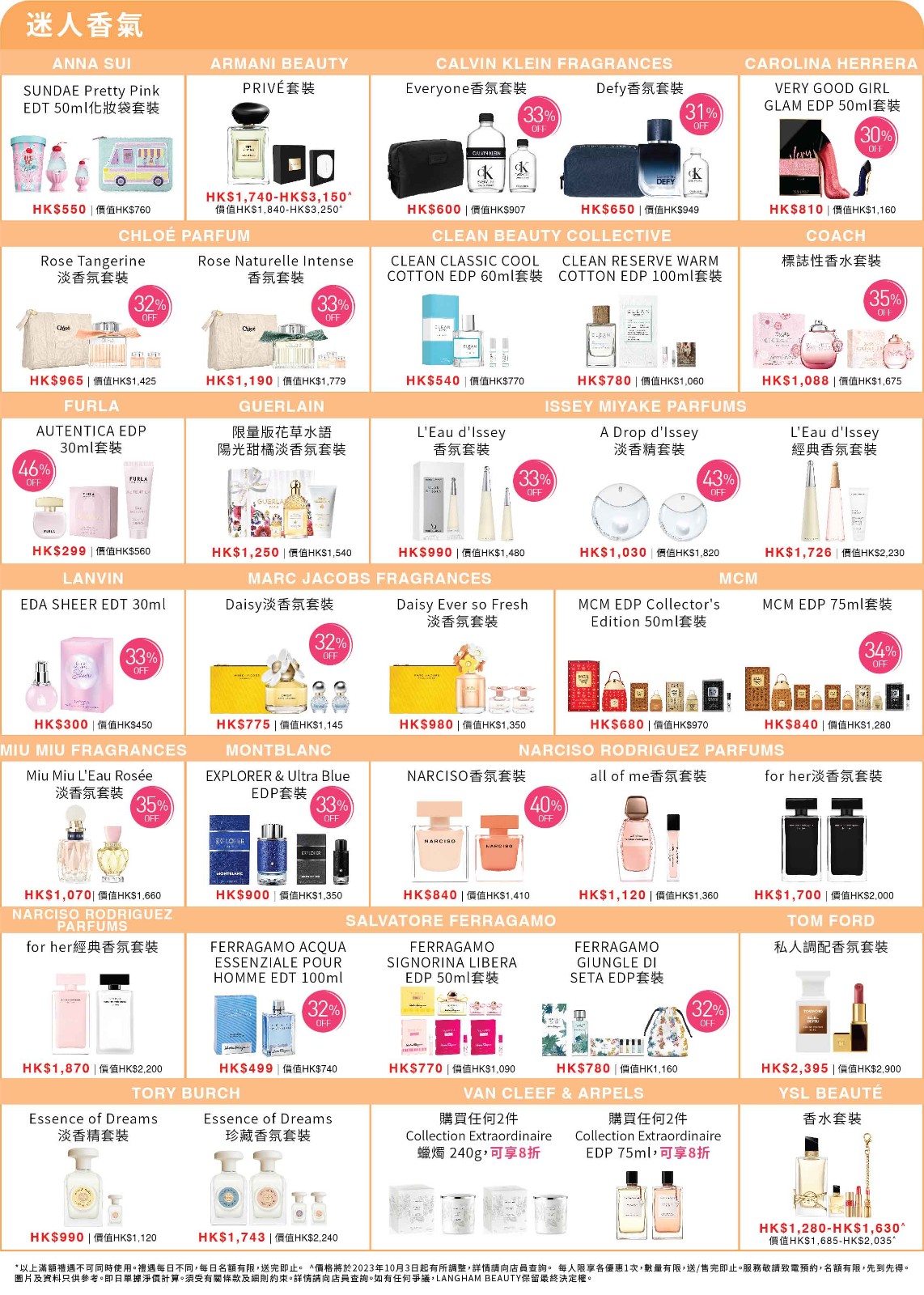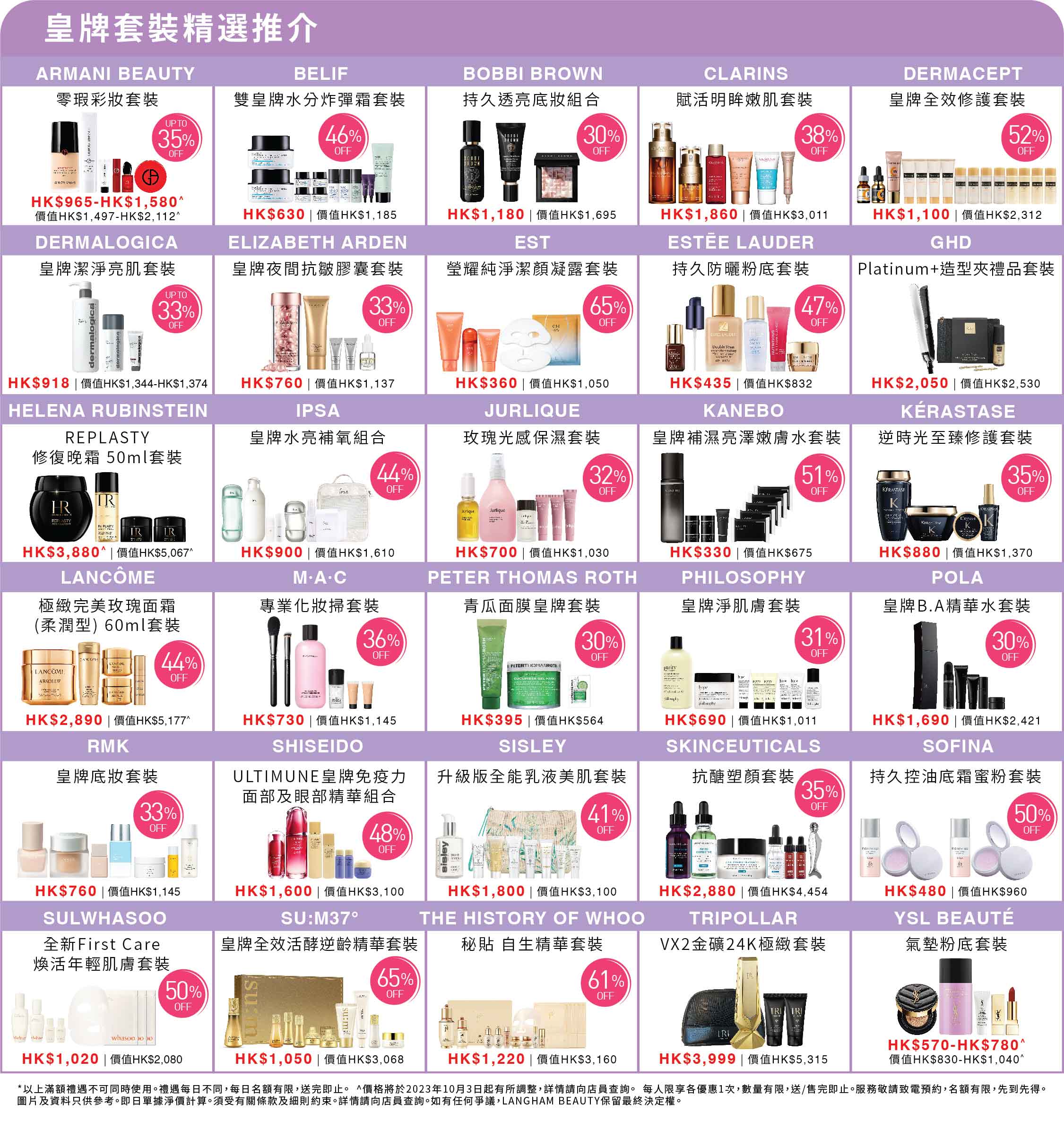 Langham Beauty Fest F/W 2023以七彩調色盤為主題,簡約粉嫩的主色繪上色彩繽紛的顏料作為點綴,鼓勵女士拋開刻板的上班妝容?;顒悠陂g,美妝護膚產品低至二八折,如ESTēE LAUDER皇牌修復精華75ml套裝、M·A·C皇牌面部套裝、CLARINS賦活明眸嫩肌套裝、SULWHASOO First Care;買1送1優(yōu)惠有SHISEIDO買VITAL PERFECTION賦活瞬效提拉眼膜1盒(12對)送WHITE LUCENT激亮淨白面膜6片、XOVē買白松露滋養(yǎng)修復面膜5片裝送光透鑽肌面膜5片裝等。另有高奢品牌的熱賣香水優(yōu)惠,以至抵價塑造在浪漫秋冬散發(fā)奢寵氛圍。其間購物滿HK$300,能獲價值HK$100禮品;購物滿HK$1000,能獲價值達HK$900禮品。