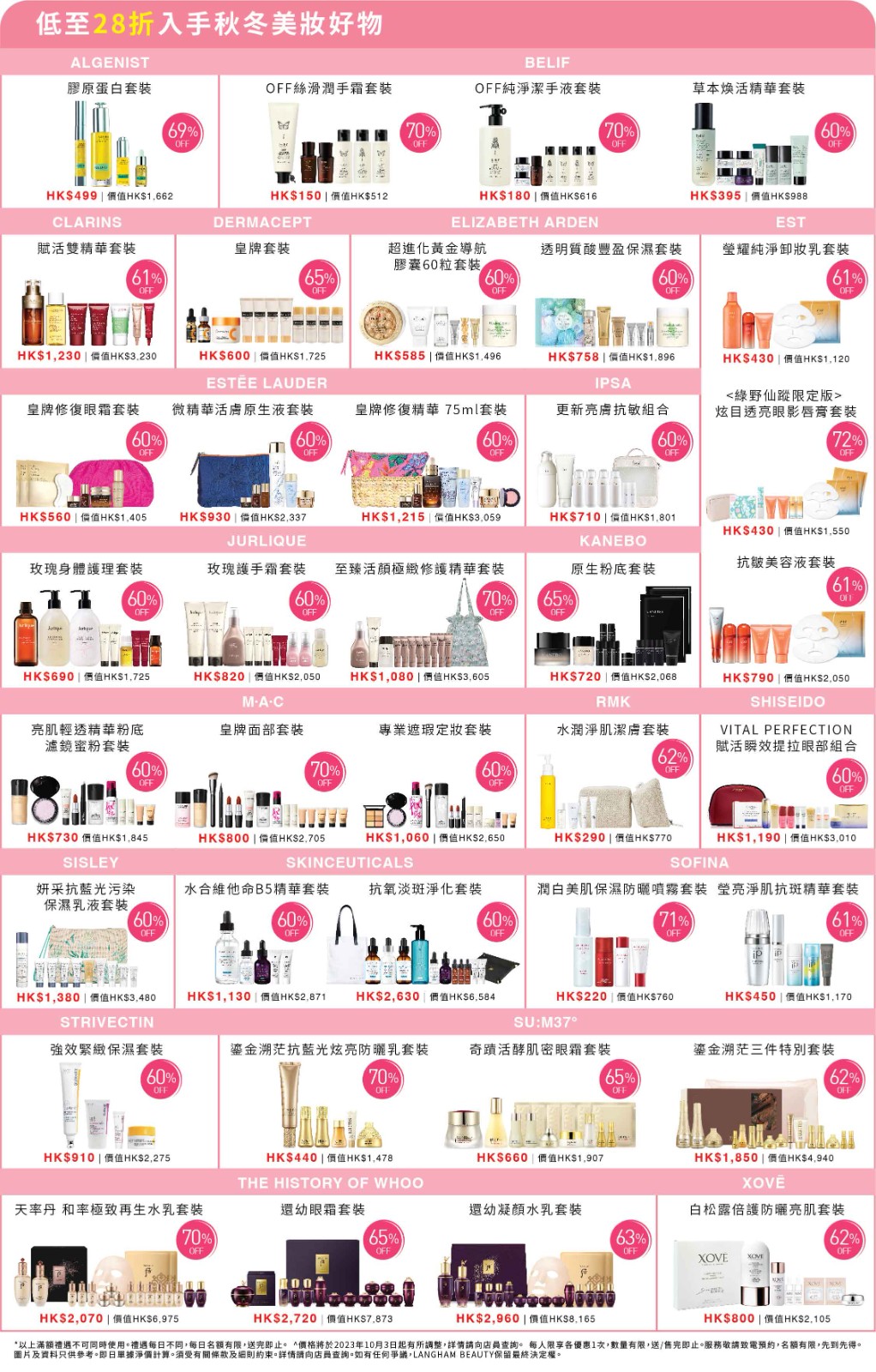 冬季即將來臨,女士要開始入手新化妝護膚品,於年尾派對成為最美主角。旺角朗豪坊美妝概念店LANGHAM BEAUTY的購物盛典於即日起至10月15日舉行,場內美妝好物低至二八折,有逾300款美妝禮遇及8000多份禮品等?;顒悠陂g,設有華麗夢幻化妝間,搭配合適妝容及裝束,在3個不同風格的化妝間打卡留念,同時並有快閃主題化妝車和美夢特派員,限時派送心形鋁鏌氣球及七彩貼紙包。