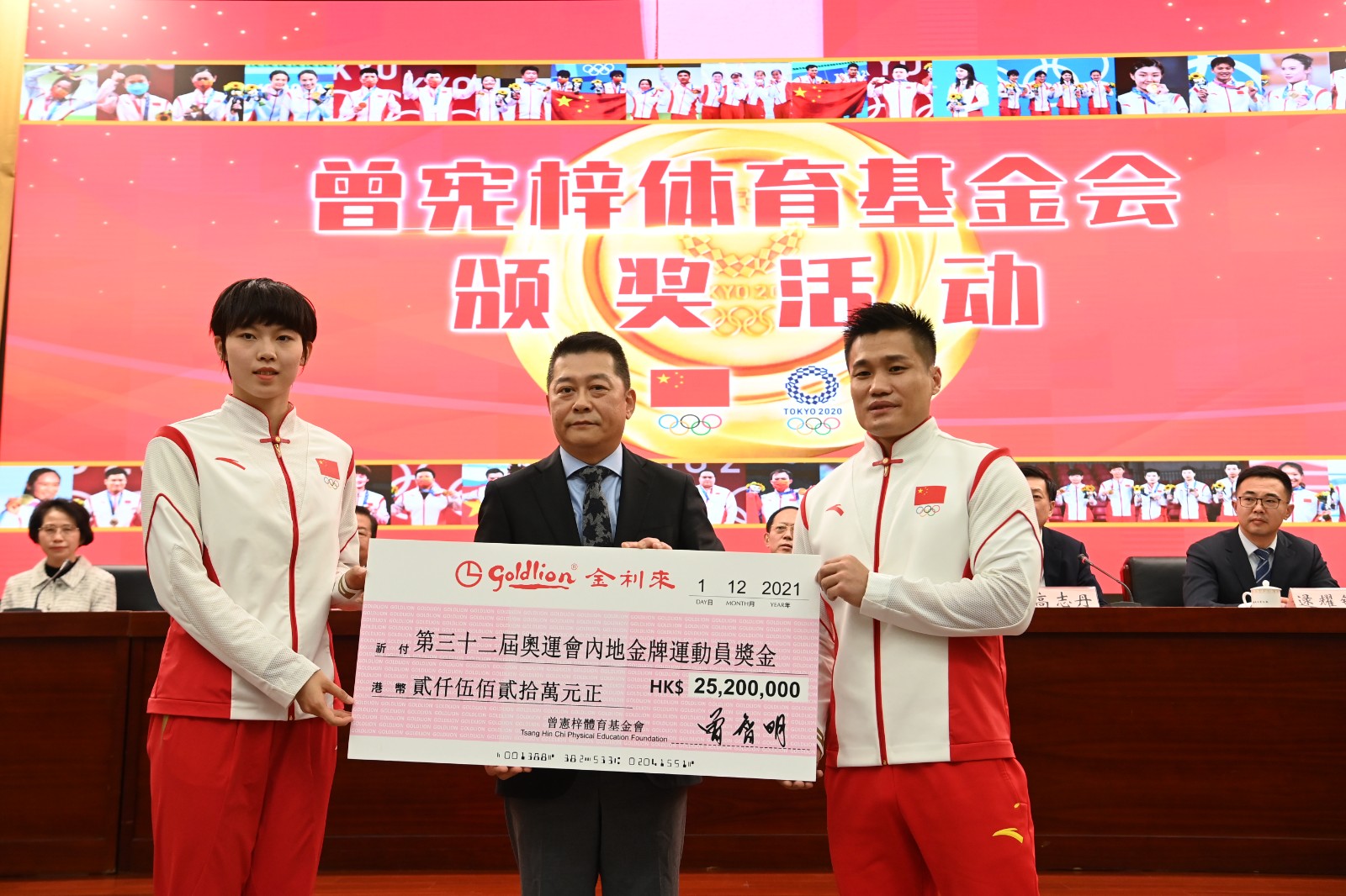 2021年曾智明理事長(zhǎng)頒發(fā)獎(jiǎng)金支票予32屆東京奧運(yùn)金牌運(yùn)動(dòng)員代表呂小軍、楊浚瑄。