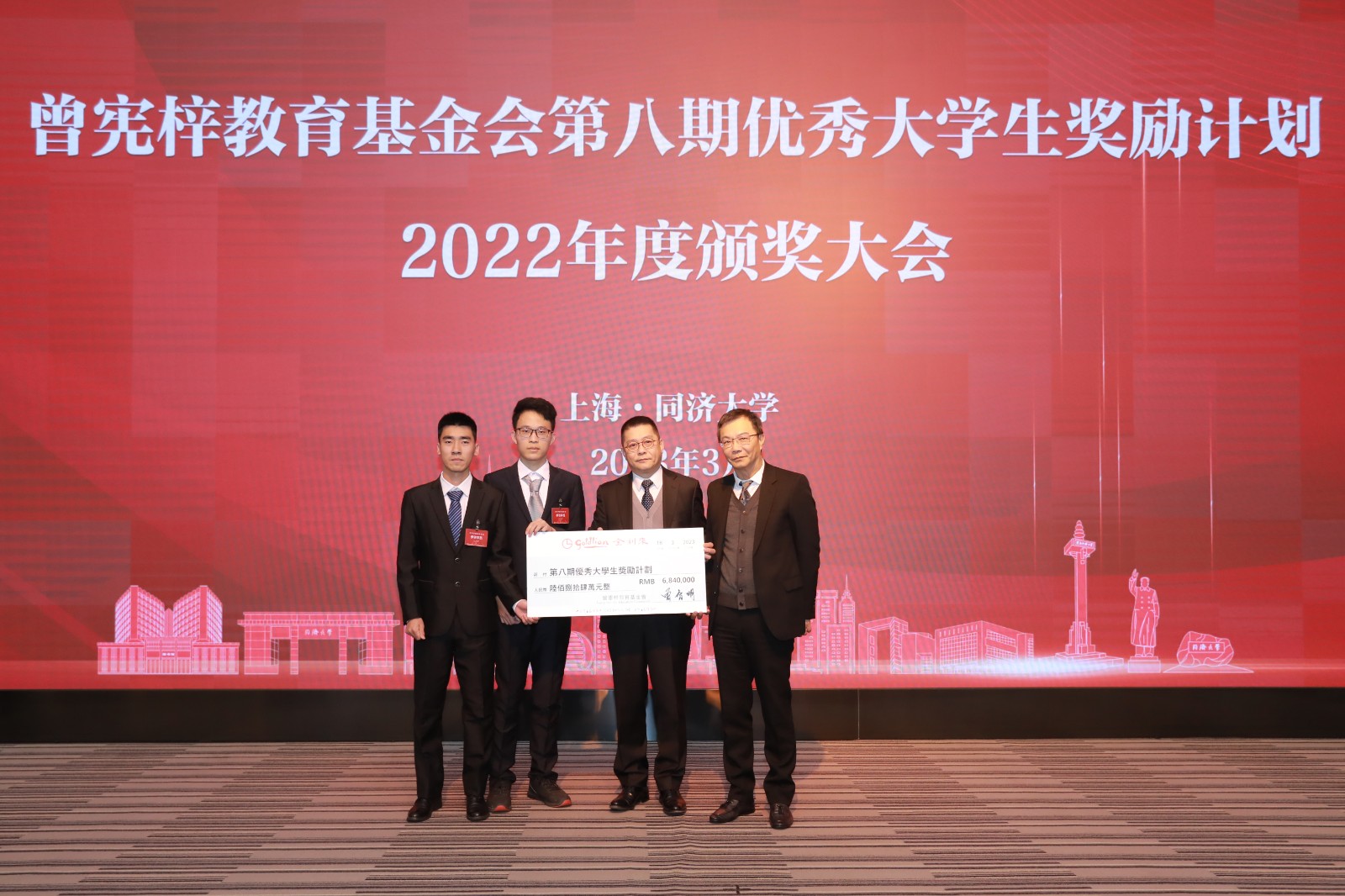 曾智明理事長(zhǎng)(右二)向優(yōu)秀大學(xué)生代表頒發(fā)獎(jiǎng)學(xué)金。
