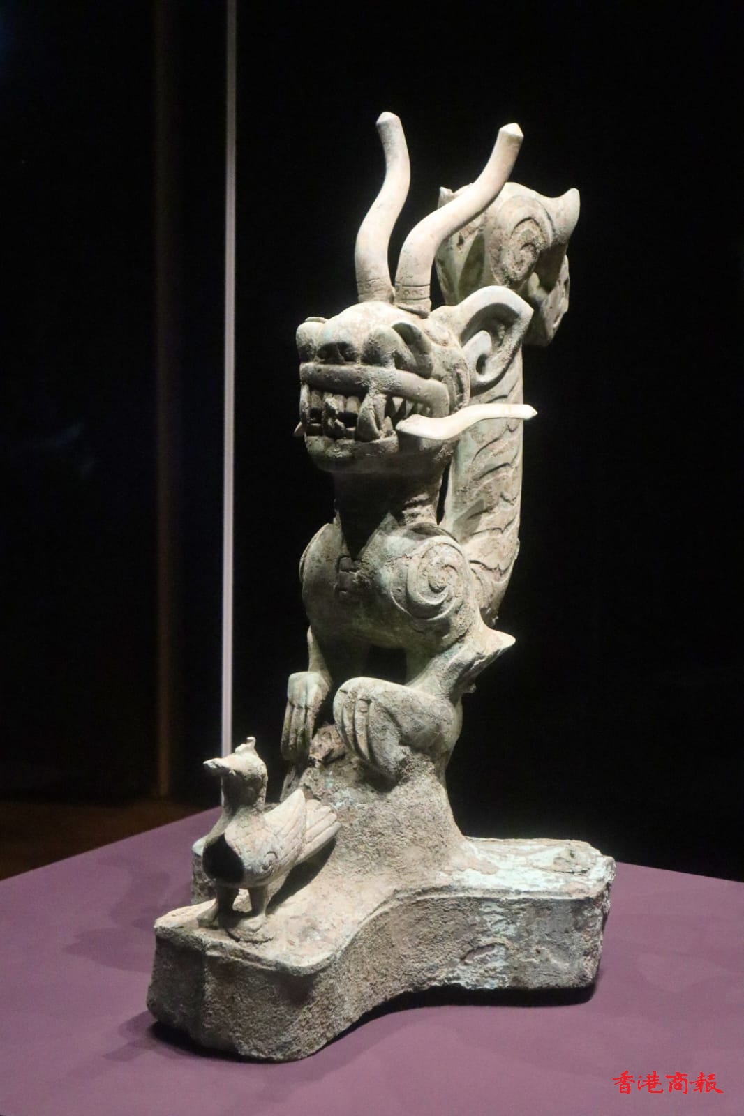 這件身體上翹的虎頭龍是三星堆目前所見(jiàn)最高的動(dòng)物造型青銅器之一。牠凸眼、獠牙,口銜帶狀物;身上條狀斑紋內(nèi)有黑彩;基座三叉前端各鑄接一小立鳥(niǎo)(一說(shuō)鴨),鳥(niǎo)上有朱砂紅彩。罕見(jiàn)的是身體近腹部的地方,用銅絲連接了一塊長(zhǎng)方形補(bǔ)釘狀的青銅片,推測(cè)此處曾經(jīng)有一個(gè)洞口。