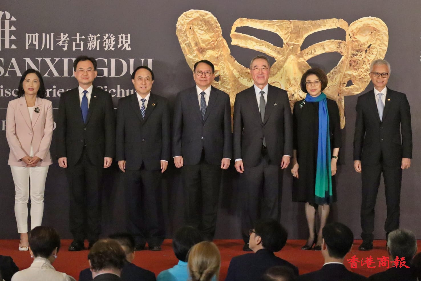 政務(wù)司司長(zhǎng)陳國(guó)基今日出席香港故宮文化博物館「凝視三星堆──四川考古新發(fā)現(xiàn)」特別展覽開(kāi)幕典禮。圖示陳國(guó)基(中)、四川省文化和旅遊廳副廳長(zhǎng)兼四川省文物局局長(zhǎng)王毅(左三)、西九文化區(qū)管理局董事局主席唐英年(右三),以及其他嘉賓在典禮合照。