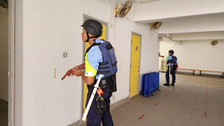 警方今日(26日)進行校園反恐演習(xí),模擬有數(shù)人闖入校園,並持刀於校內(nèi)進行襲擊及縱火,機動部隊人員迅速抵達現(xiàn)場,成功制服所有疑犯,並安全有序地疏散全校師生。
