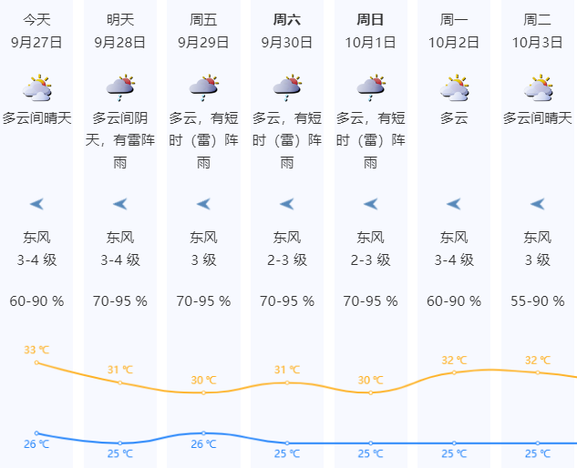 ? 30日-10月1日多雲(yún)天氣為主,有短時(shí)(雷)陣雨。