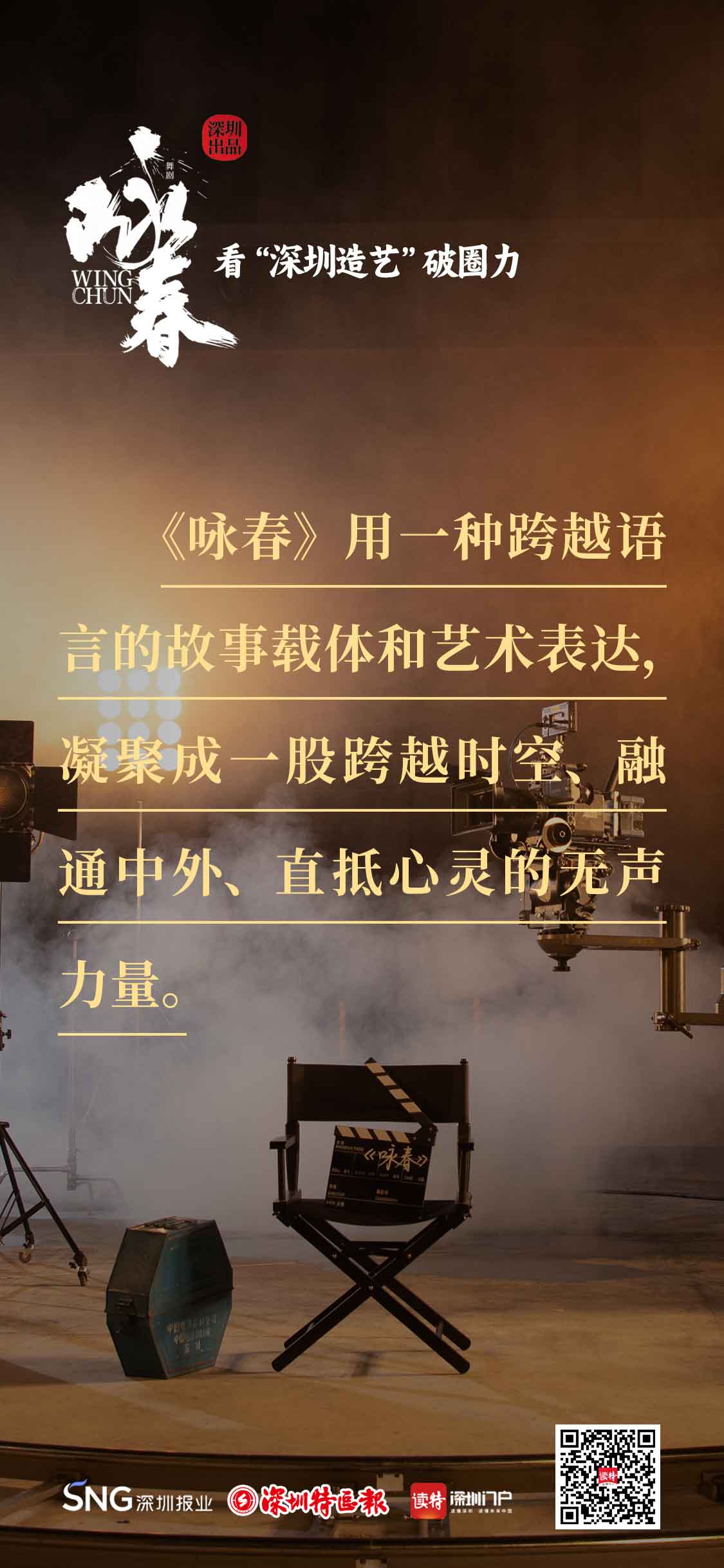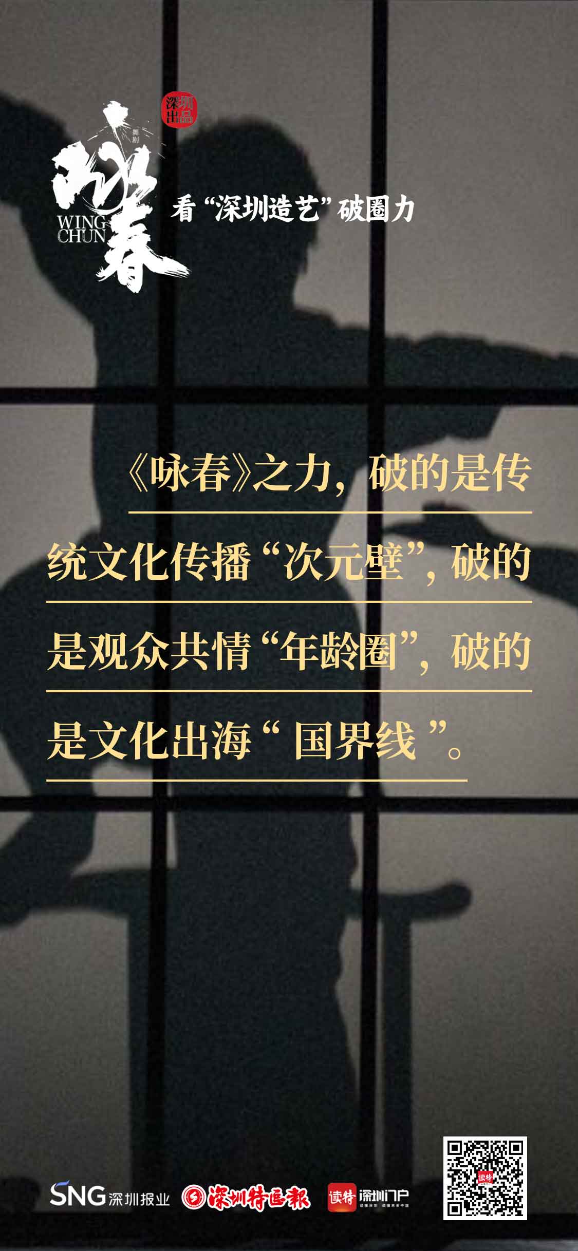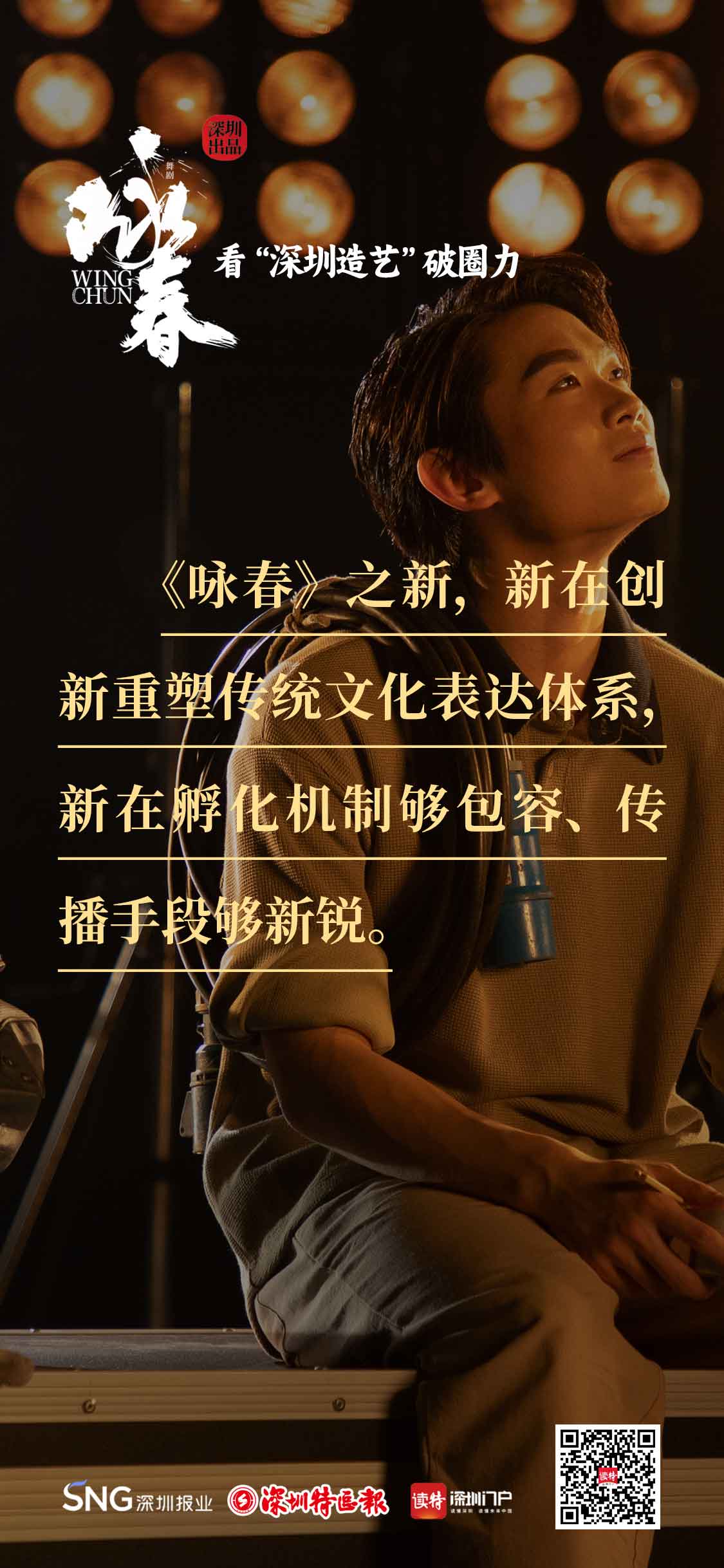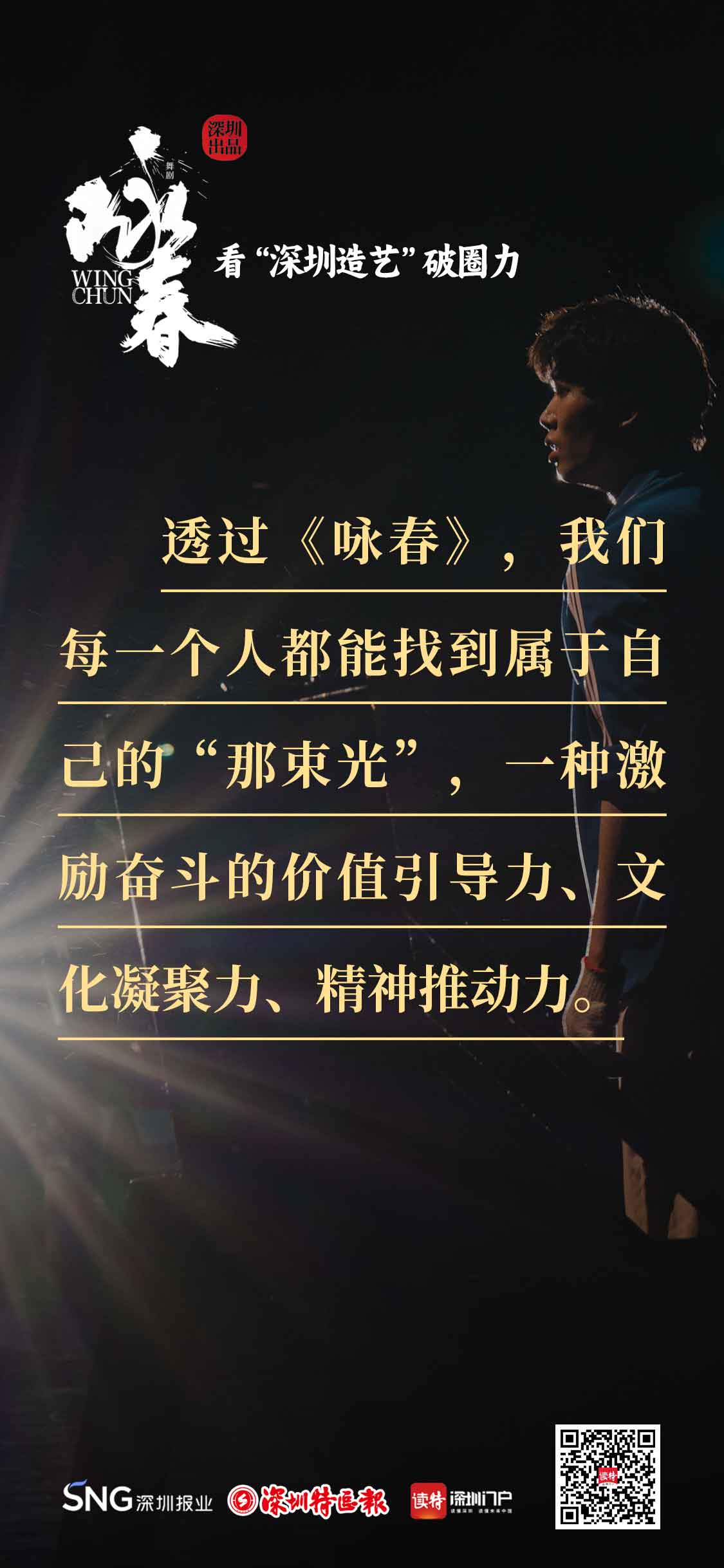 強(qiáng)大的「破圈力」,根植中華文明、嶺南文化沃土?!鸽p場景」「雙故事」帶來時(shí)代共振,「雙非遺」呈現(xiàn)中國傳統(tǒng)文化內(nèi)涵,《詠春》展示出了一個(gè)人、一個(gè)地區(qū)、一座城市乃至一個(gè)民族的奮進(jìn)史,用深圳表達(dá)詮釋嶺南文脈、講述灣區(qū)特色、彰顯中國氣派。熱血故事描摹每一個(gè)人心中的武林世界,臺前幕後點(diǎn)亮每一盞燈與心中難熄的夢,人文情感喚起每一位遊子的悠長歸思……透過《詠春》,我們每一個(gè)人都能找到屬於自己的「那束光」,一種激勵奮鬥的價(jià)值引導(dǎo)力、文化凝聚力、精神推動力。