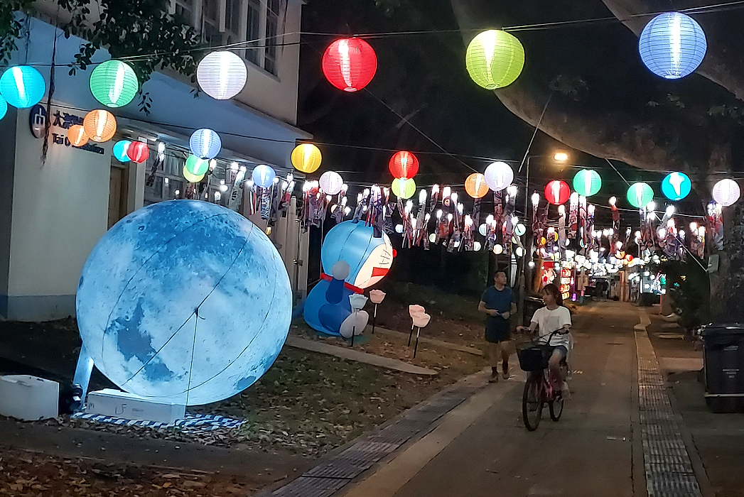 中秋佳節(jié)將至,新界區(qū)多個場地的綵燈早已亮起,如沙田公園、屯門公園、天水圍公園,東涌海濱長廊、愉景灣等,而近年的打卡熱點大澳,千個花燈照亮區(qū)內(nèi)主要街道石仔埗街及吉慶街,以及關(guān)帝廟廣場。今年是癸卯兔年,適逢中秋,月兔成為展出亮點,在天水圍公園,大月兔背靠巨型月亮作休息狀,可愛度爆燈。大澳石仔埗街也有兩個大型月球,以及小型九大行星,在夜幕來臨時,遊人移動眼球,可看到月兔跳入不同行星內(nèi),十分有趣。(記者:鄭玉君、崔俊良 攝影:馮瀚文)