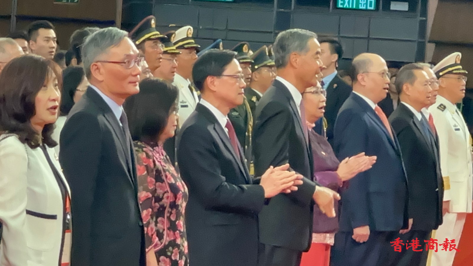 現(xiàn)場(chǎng)唱國(guó)歌,梁振英和李家超全程拍手跟唱。記者 木子攝