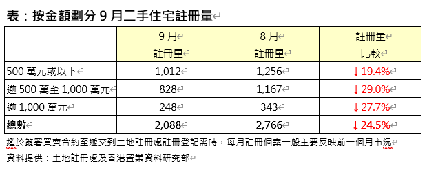 若以金額劃分9月二手住宅註冊(cè)量表現(xiàn),當(dāng)中500萬(wàn)元或以下二手住宅錄1012宗註冊(cè),較8月的1256宗減少約19.4%;逾1000萬(wàn)元二手住宅錄248宗註冊(cè),較8月的343宗減少約27.7%;逾500萬(wàn)至1000萬(wàn)元二手住宅錄828宗註冊(cè),較8月的1167宗減少約29%(見(jiàn)表)。
