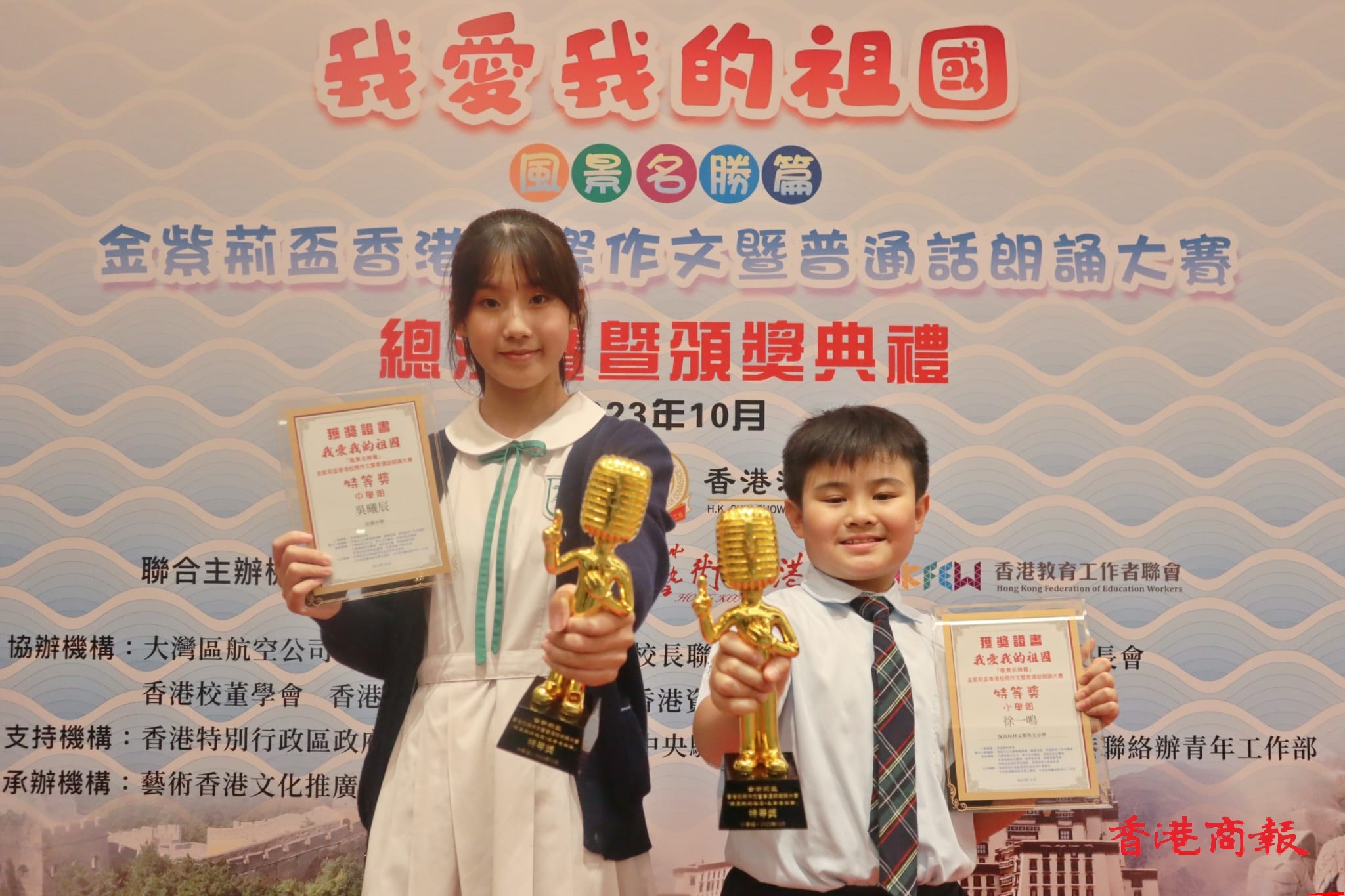 由香港潮州商會(huì)主辦的第二屆「我愛(ài)我的祖國(guó)」香港校際作文暨普通話(huà)朗誦大賽總決賽暨頒獎(jiǎng)典禮,今日(7日)於香港故宮文化博物館舉行。全港近百間中小學(xué)各推薦一名學(xué)生參賽,經(jīng)過(guò)3個(gè)月多場(chǎng)選拔至昨天終誕生中、小學(xué)組各1名特等獎(jiǎng)、4名一等獎(jiǎng)、9名二等獎(jiǎng)、13名三等獎(jiǎng)及22名優(yōu)秀獎(jiǎng),特等至三等獎(jiǎng)學(xué)生可獲大灣區(qū)航空公司頒贈(zèng)來(lái)回臺(tái)灣機(jī)票一張。小學(xué)組特等獎(jiǎng)得主為保良局林文燦英文小學(xué)徐一嗚,中學(xué)組特等獎(jiǎng)得主為培僑中學(xué)吳曦辰。